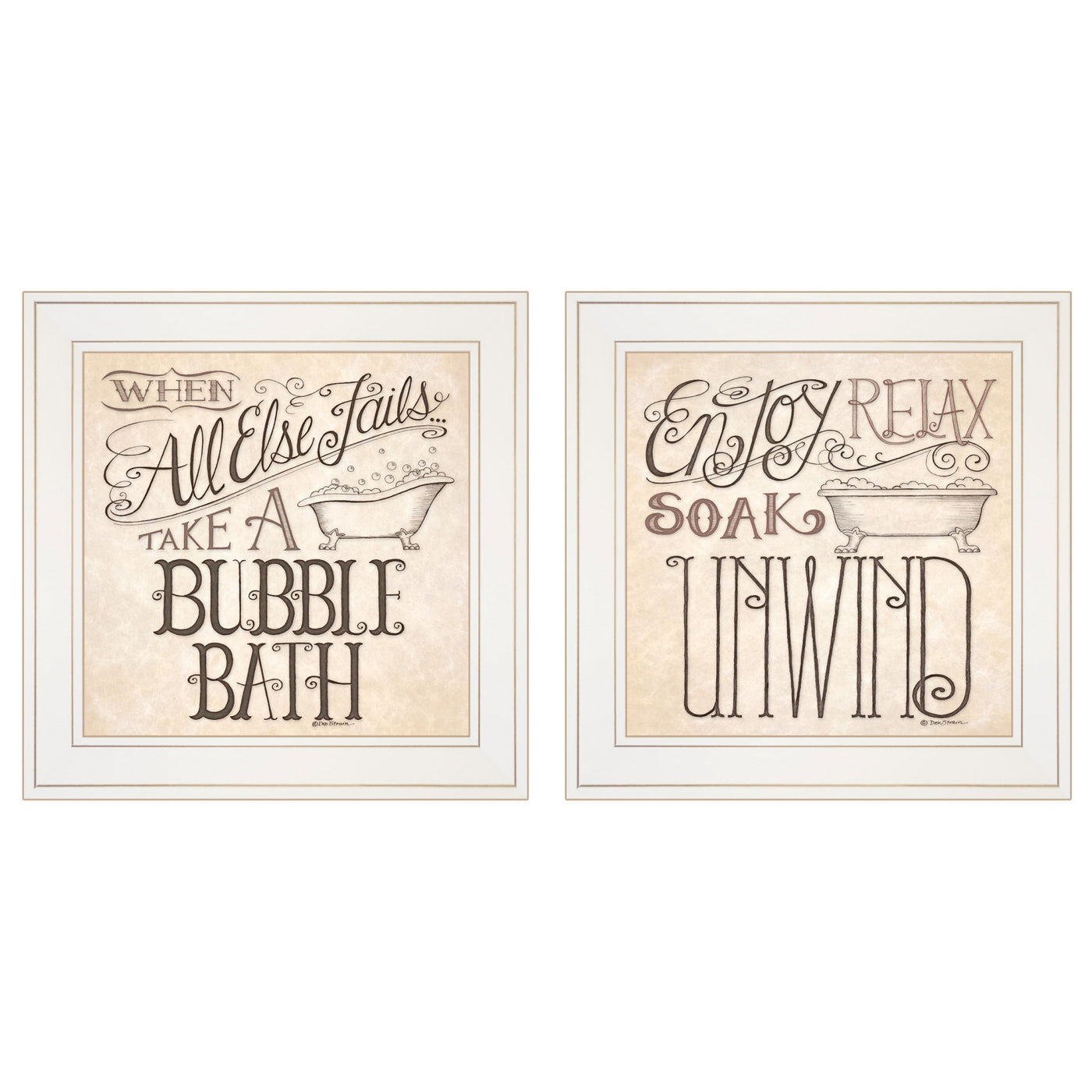 Unique and decorative, this set of two soak & unwind 2-piece vignette 2 white framed print wall art will leave a lasting impression. This print is a visual artistic expression that allows you to decorate your space in style. Reproduced for you on paper, this hanging accent will be a trendy and fashionable way to dress your walls. Hang on your wall to add some up to fashion and Instantly liven up your space with this art that brings that color and dimension to your walls. 15' H x 15' W x 1' D