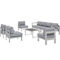 Enhance your outdoor relaxation with the Shore Outdoor Patio Collection, designed for durability and strength. Crafted with anodized brushed aluminum frames and non-marking black plastic foot caps, the Shore Outdoor Sectional Sofa pieces are equipped with resilient fabric canvas that withstands any weather conditions. The Shore Outdoor Patio Sectional Furniture Set adds a touch of elegance to casual gatherings, offering versatility and reliability. The set includes four Shore Armless Chairs, one Shore Coffee Table, one Shore Left-Arm Corner Sectional Loveseat, and one Shore Right-Arm Loveseat.
