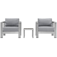Enhance your outdoor relaxation experience with the Shore Outdoor Patio Collection, known for its robustness and longevity. Crafted from anodized brushed aluminum frames and featuring non-marking black plastic foot caps, the Shore Outdoor Sectional Sofa pieces are equipped with durable fabric canvas that withstands any weather. The Shore Outdoor Patio Sectional Furniture Set effortlessly complements casual get-togethers, offering a stylish appearance and reliable versatility. The set includes one Shore Side Table and two Shore Armchairs.
