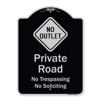Signmission Designer Series Sign - Private Road No Trespassing Or Soliciting With No Outlet Symbol Black & Silver 18' X 24' He