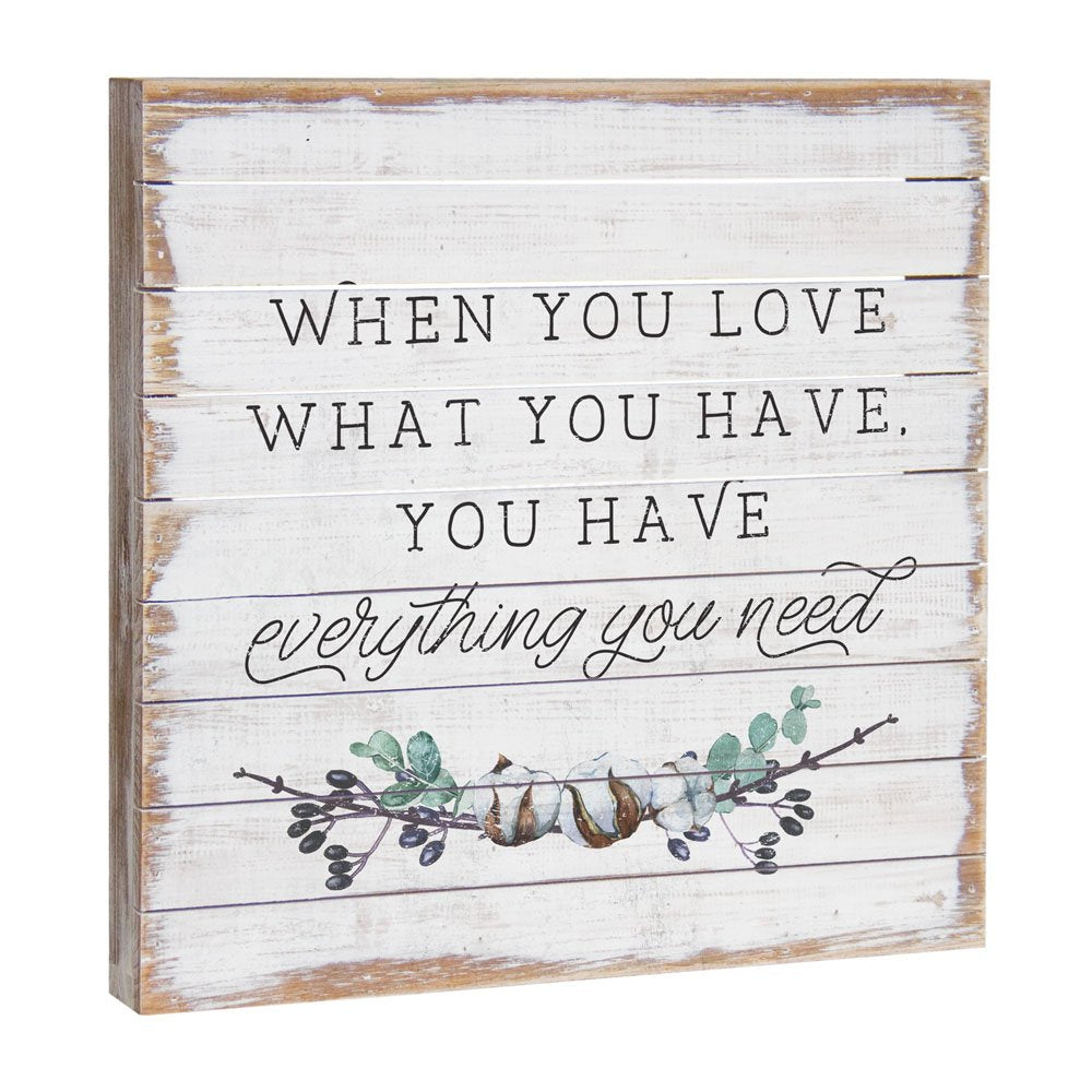 Q: What does the quote on the sign say?A: The rustic sign reads 'When you love what you have, you have everything you need,' adding a heartfelt message to your decor.