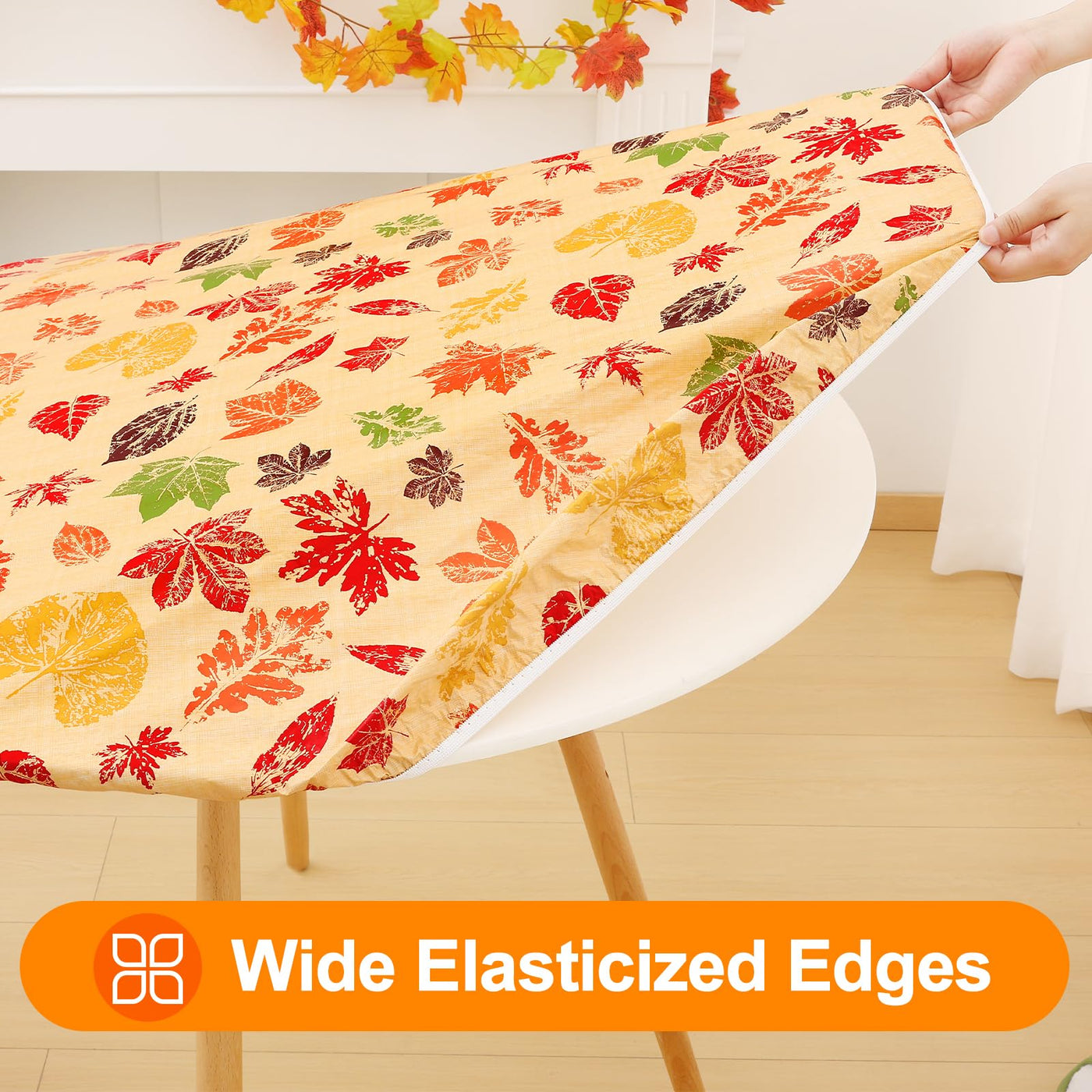 Smiry Plastic Thanksgiving Tablecloth, Fall Leaves Waterproof Elastic Fitted Table Covers For 45' - 56' Tables, Wipeable Flannel Backed Vinyl Tablecloths For Autumn Harvest, Parties, Rust