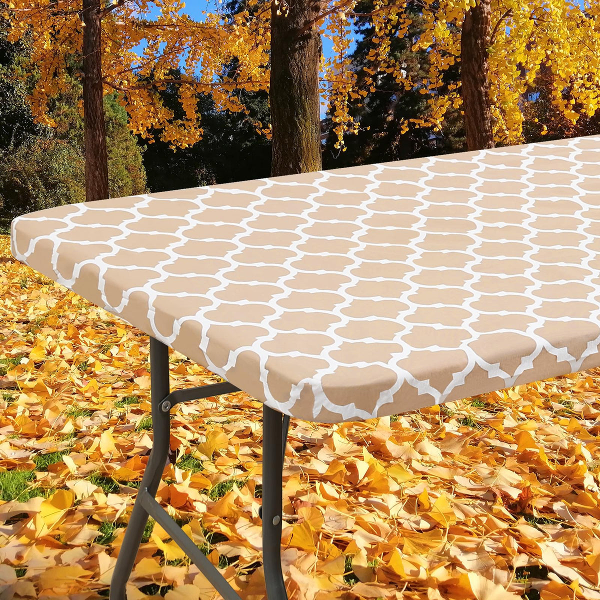 Smiry Elastic Table Cloth Brings Convenience To Your Dining. Features: - Elastic Fitted & Wind Proof - Waterproof & Spillproof - Reusable & Scratch Proof - Convenient & Wipe Clean - Non-Slip Flannel Backing Color: Grey; Black; Blue; Teal; White; Khaki; Yellow; Red; Wood; Clear Size: Rectangle: 24X48 Inches; 4Ft - 30X48 Inches; 5Ft - 30X60 Inches; 6Ft - 30X72 Inches; 8Ft - 30X96 Inches; Round: 36' - 44' Round; 45' - 56' Round; 57' - 68' Round; My Desk Is Made Of Wood. Will This Tablecloth Keep The Water Out Of My Desk? Our Tablecloths Are Covered With A Waterproof Vinyl Material That Effectively Protects Table Away From Water, Milk, Juice And Other Liquids From Spilling Onto The Table Surface. I Want To Use This Tablecloth Outdoors. Will It Blow Away? We Specially Added Elastic Rope Around The Tablecloth, So That The Table Cover Can Fix On The Table Without Moving.