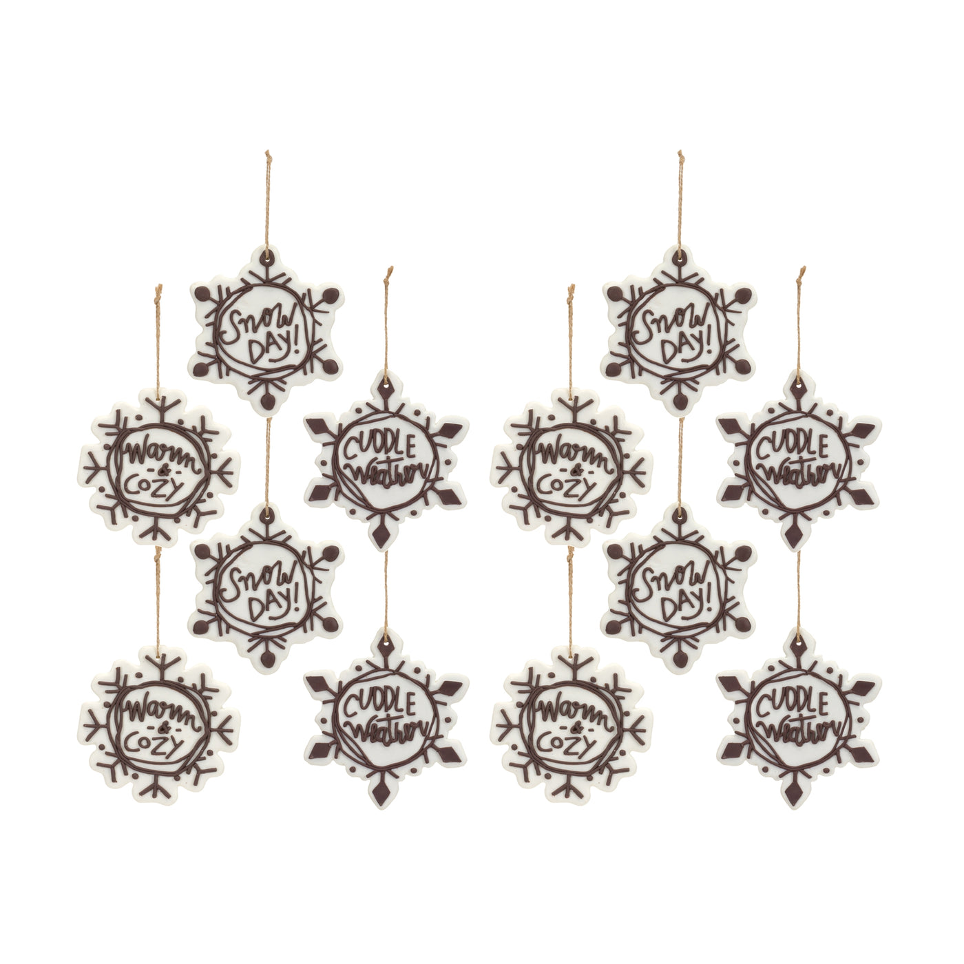 Snowflake Ornament (3 Asst) 4.25''H, 4.5''H, 5''H Plastic Adorn your Christmas Tree with this beautiful set of Snowflake Ornaments. Featuring the sentiments ''Snow Day!'', ''Warm & Cozy'', and ''Cuddle Weather'', the whimsical snowflake design paired with the rustic white and brown finish makes this set the perfect addition to your holiday tree decor. The pieces can be used as gifts for friends to cherish, or you can display the set on your own Christmas tree and enjoy them for years to come. Measures 4.5 x 0.25 x 4.5 in.; 4.5 x 0.25 x 4.25 in.; 4.25 x 0.25 x 5 in. Primary Materials: PVC Reccommended for indoor use only Comes with a string for easy hanging