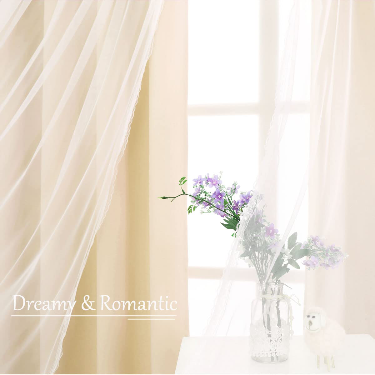 Q: What unique design features do these curtains have?A: The curtains feature a crushed sheer layer with a unique lace seam design, providing a dreamy and romantic look that enhances any home decor.