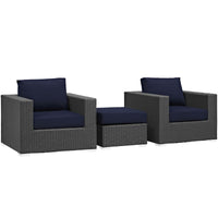 Enhance your patio with the innovative Sojourn Outdoor Patio Furniture series. The Sojourn Patio Outdoor Collection provides a versatile seating experience that can be easily rearranged to suit your needs. Equipped with top-of-the-line Sunbrella fabric cushions, synthetic rattan weave, UV protection, and a powder-coated aluminum frame, this outdoor conversation set is perfect for enjoying your time outdoors. This particular set includes one Sojourn Rattan Outdoor Patio Ottoman and two Sojourn Rattan Outdoor Patio Armchairs.