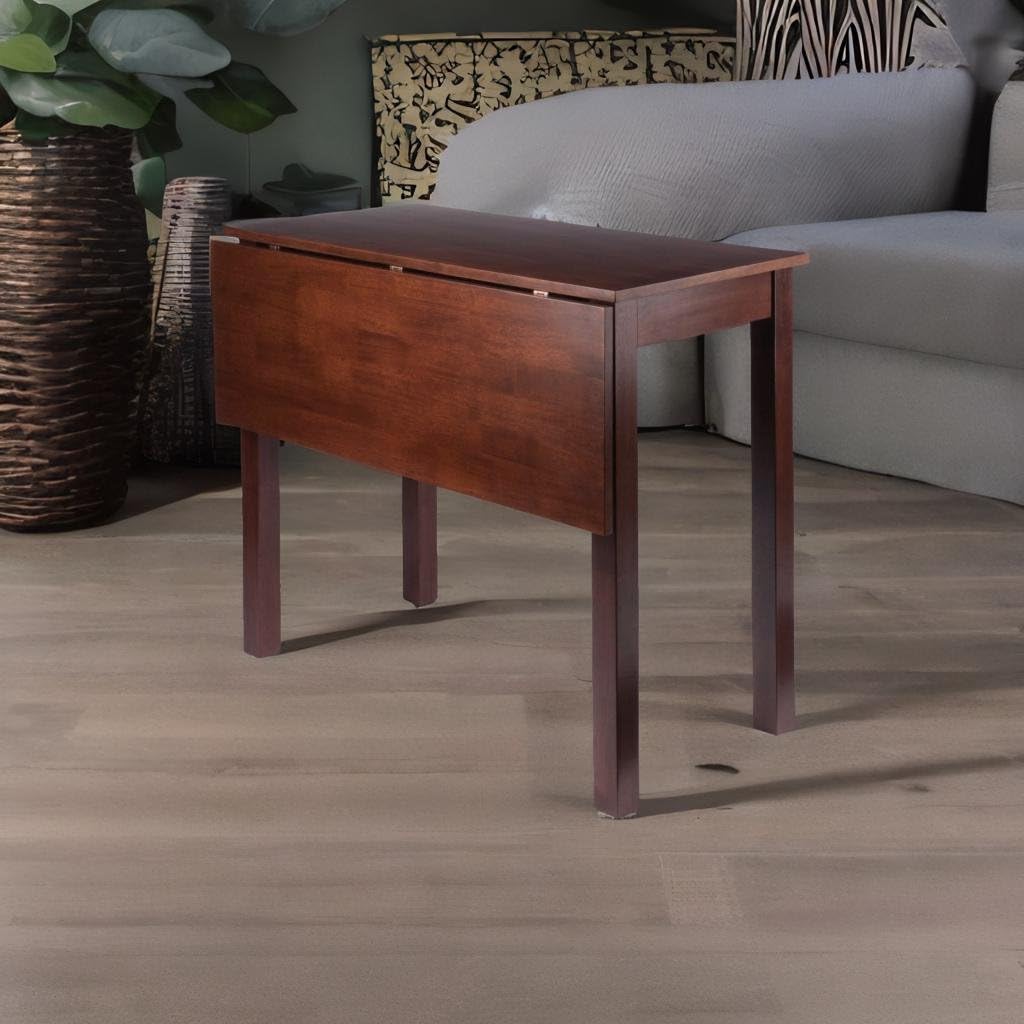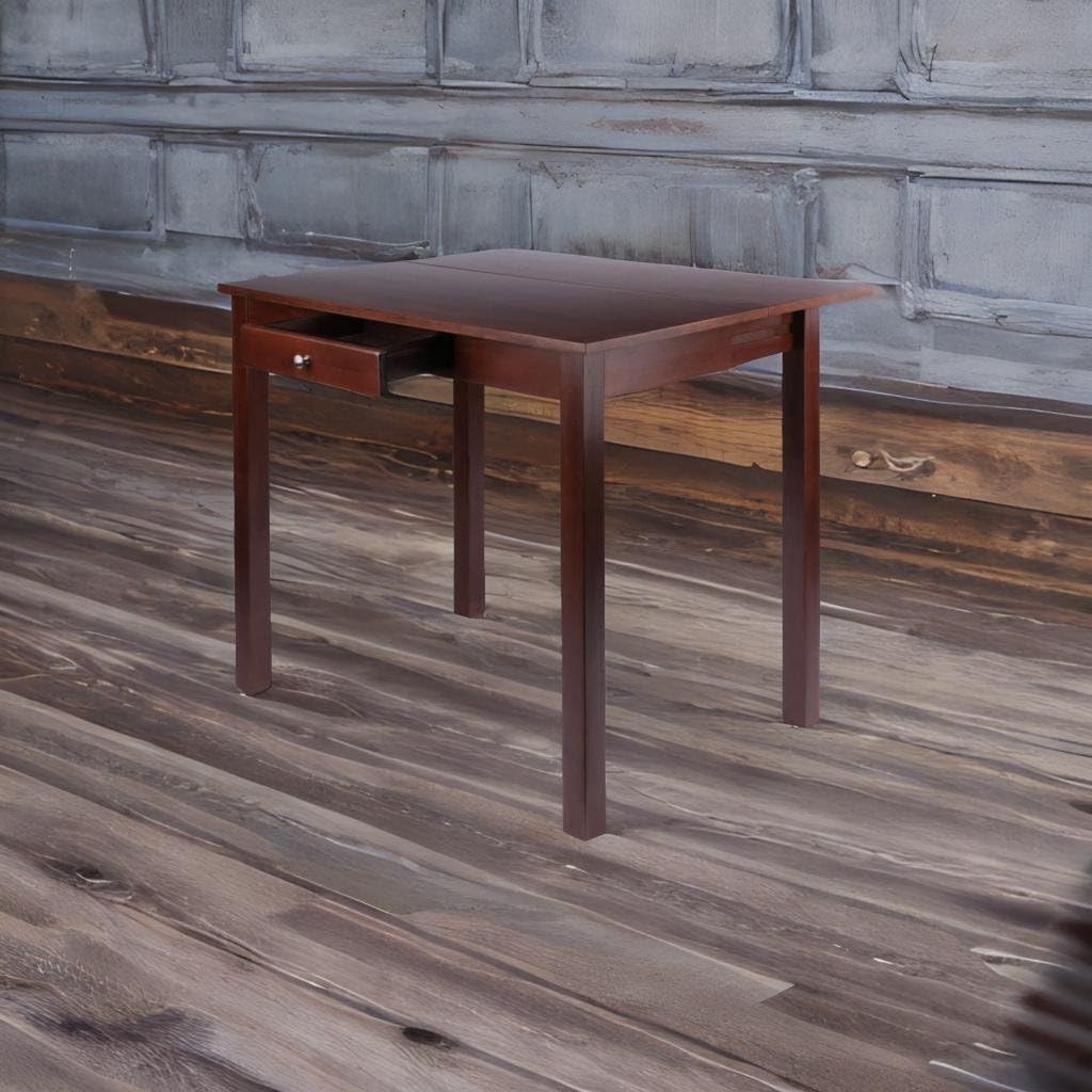 Introducing the Ergode Perrone High Table with Drop Leaf Dining Table, a sophisticated and simple addition to your home. This versatile table is designed to maximize space in small areas, offering a practical solution. Expand the table size by extending the back apron and sliding out the legs to support the drop leaf. It comfortably accommodates four people when fully extended and creates an intimate setting for two when folded down. The table features a convenient center drawer for storage and can be used as a console or workspace with the leaf closed. Crafted with a durable solid wood frame and finished in walnut, it ensures long-lasting durability. Pair it with Ergode stools for a cohesive aesthetic. Assembly is required, and all necessary hardware is included. Dimensions: 29.1"H x 40"W x 34.8"D (with leaf extended), 29.1"H x 40"W x 21.6"D (with leaf closed). Inside drawer dimensions: 12.1"W x 8.9"D x 2"H. Clearance underneath table (Front): 24.8"H x 34.1"W, Clearance underneath table (Side): 24.8"H x 14.2"W. Ships in 1 box.