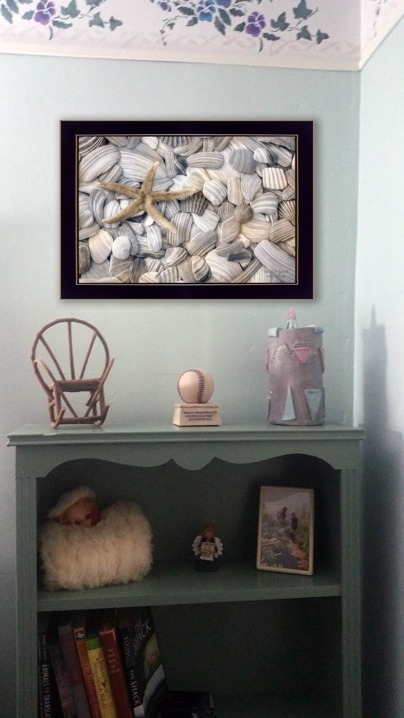 Unique and decorative, this starfish and seashell 1 black framed print wall art will leave a lasting impression. This print is a visual artistic expression that allows you to decorate your space in style. Reproduced for you on paper, this hanging accent will be a trendy and fashionable way to dress your Adding this hanging wall art to your space to make your room feel more finished and attractive. Utilize this opportunity to create a focal point in the room with the room with the room. This wonderful wall decor op. tion. 14' H x 20' W x 1' D