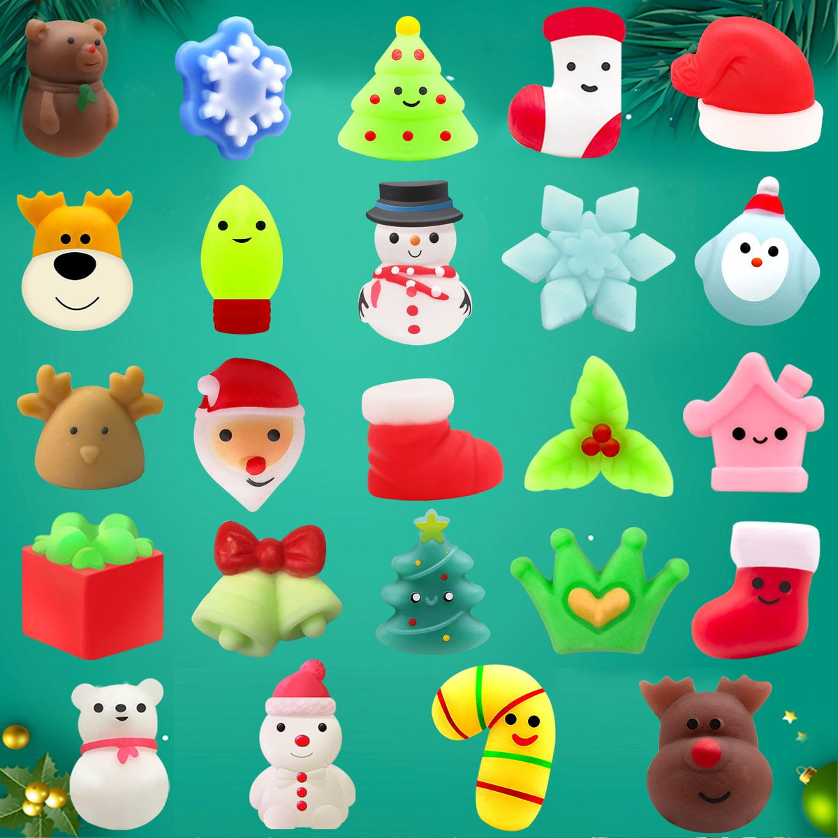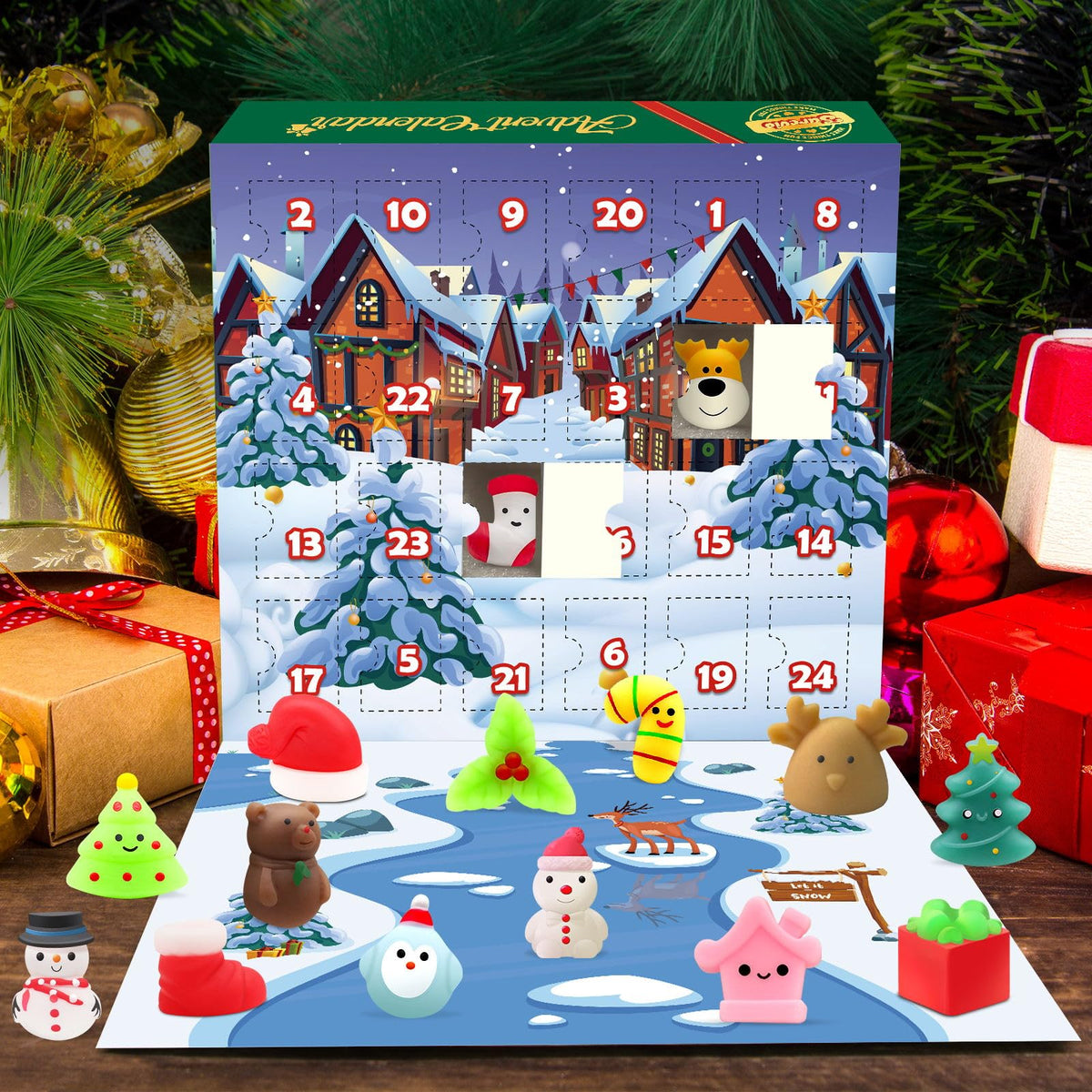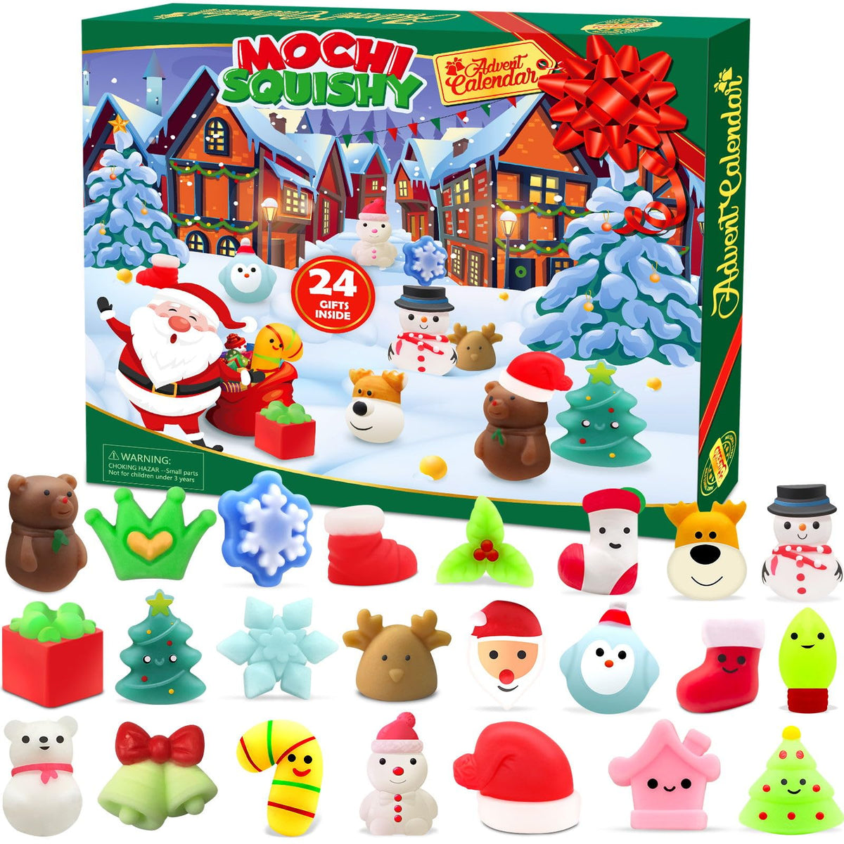 Q: What types of toys are included in the Advent Calendar?A: The Advent Calendar includes 24 assorted mochi squishy toys, offering a fun and memorable surprise for kids to enjoy each day leading up to Christmas.
