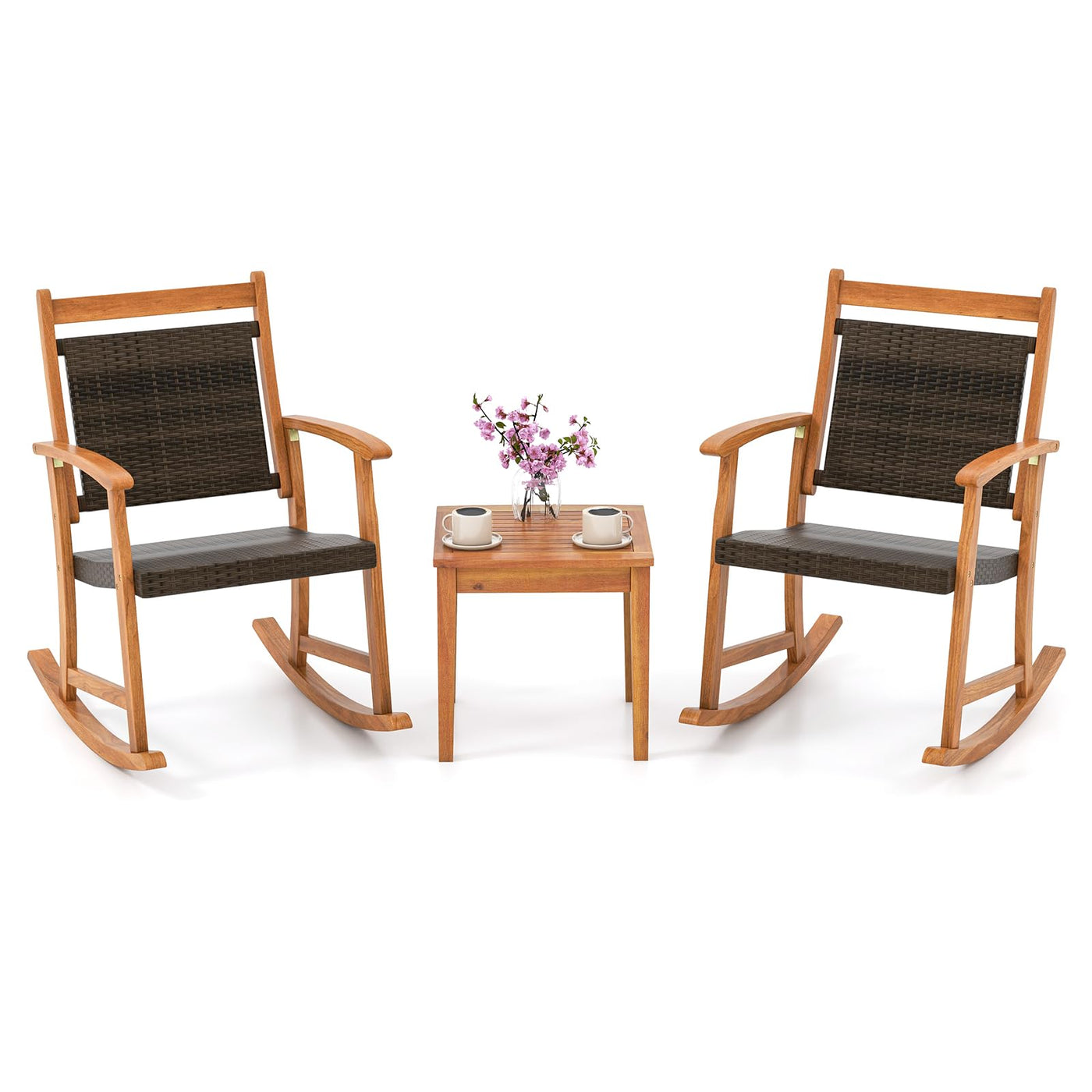 Tangkula 3 Pieces Patio Rocking Chair Set, Patiojoy Acacia Wood Rocker With Side Table, Outdoor Chairs With Wicker Rattan Seat & Backrest, Patio Bistro Set For Garden, Backyard, Poolside