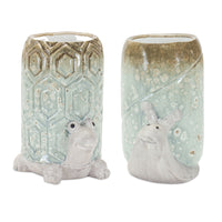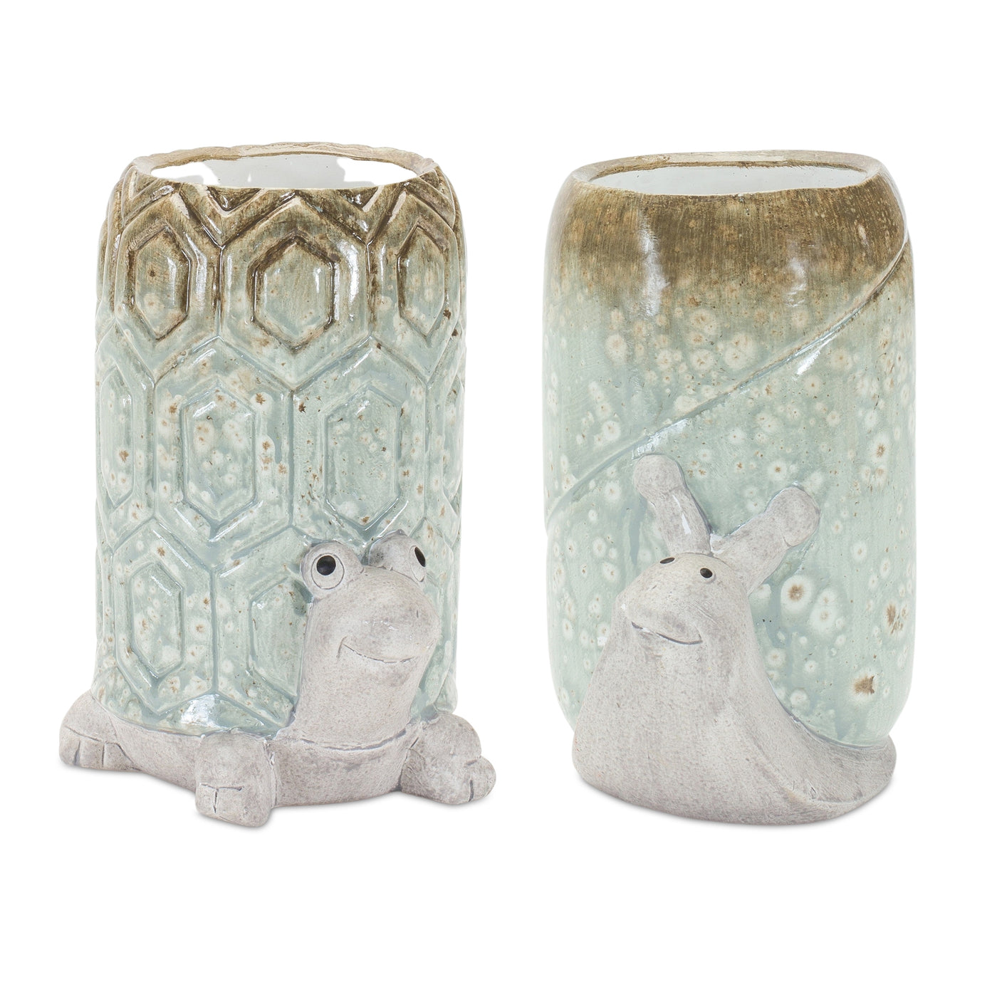 Snail and Turtle Planter (2 Asst) 5''L x 6''H, 4.5''L x 6.25''H Terra Cotta Add a pop of color to your spring decor with this beautiful set of Snail and Turtle Vases. Featuring two pieces, the earthy colors paired with the whimsical character design with butterfly accents is the perfect combination to create a timeless display. The quality terracotta composition is sure to last for seasons to come. Add a bunch of dried florals or fresh cut garden stems to each vase to compelte the look. Measures 4.5 x 4 x 6.25 in.; 5 x 3.5 x 6 in. Primary Materials: Terra Cotta Reccommended for indoor use only