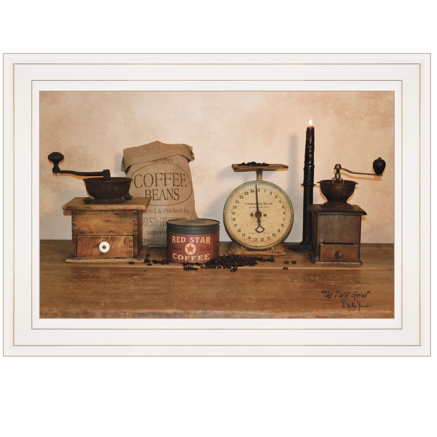 The daily grind 1 white framed print wall art is the perfect decorative accessory for your home. This print is a visual artistic expression that allows you to decorate your space in reproduced for you on style. This hanging decorative accent will be a trendy and fashionable way to dress your wall. Adding this hanging wall art to your space to make your room feel more finished and attractive. Instantly liven up your space with this art that brings color dimension to your home. 1' H x 1 5' W x 1' D