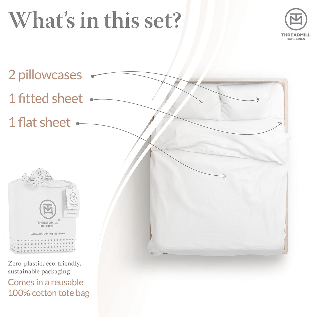 Q: What material are the Threadmill bed sheets made of?A: The Threadmill bed sheets are made from 100% pure cotton with a solid sateen weave, providing ultimate softness and breathability.