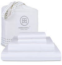 Feel The Comfort And Softness Of 100% Pure And Natural Cotton With Our Exclusive 500 Thread Count Bedding Set. Premium 500 Thread Count, Natural Cotton, & Smooth Damask Weave Relax In The Divine Combination Of Luxury, Comfort And Durability With Our 500 Thread Count Bed Sheets. Made Of 100% Natural Extra Long Staple Cotton Yarns, These Lightweight & Cooling Bed Linens Can Make Sleeping A Blissful Affair. The Deluxe Damask Weave Gives Them A Lustrous Shine & Silky Smooth Feel. They Offer Ultimate Breathability To Prevent Night Sweats, Making Them Ideal For All Seasons. 4 Piece Sheet Set With Perfectly Fitting Deep Pocket Bottom Sheet From New Bedroom To Guest Room, This Complete Sheet Set Can Be Used To Complement All Your Home Decor. Each Bedding Set Includes 1 Fitted Sheet, 1 Flat Sheet, & 2 King Pillowcases. Sleep Without Any Worry Of Bunched Up Sheets With Our Elasticized Fitted Sheet. Its Generously Sized Deep Pocket Snugly Fits Even The Tallest Of Mattresses. Easy To Care, High Quality, & Diligent Craftsmanship Enjoy Sleeping On A Bedsheet That Gets Softer & Resists Fading With Every Wash. To Give You Absolute Quality & Durability With Each Sheet, The Fabric Is Expertly Woven & Stitched Together. Made Using Extra Long Staple Cotton Yarns, These Sheets Have No Loose Fibers After Regular Washes. These Machine Washable Sheets Must Be Tumble Dried On Low & Folded Right After To Prevent Wrinkles. Certified & Sustainable Practices Because We Care At Threadmill Home Linen, We Manufacture The Highest Quality Of Products In A Sustainable Manner. All Our Products & Practices Are Oeko Tex Certified For Your Safety & Trust. We Show Our Care For The Planet By Powering Our State-Of-The-Art Factory With Wind And Solar Energy. These Sheets Are Packed In Reusable Cotton Tote Bags To Prevent The Use Of Plastic. Along With Luxury And Quality, Our Products Also Come With A 100% Satisfaction Guarantee.