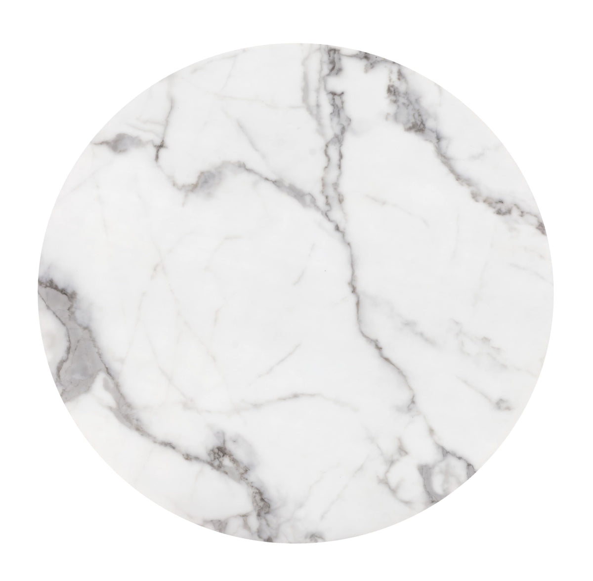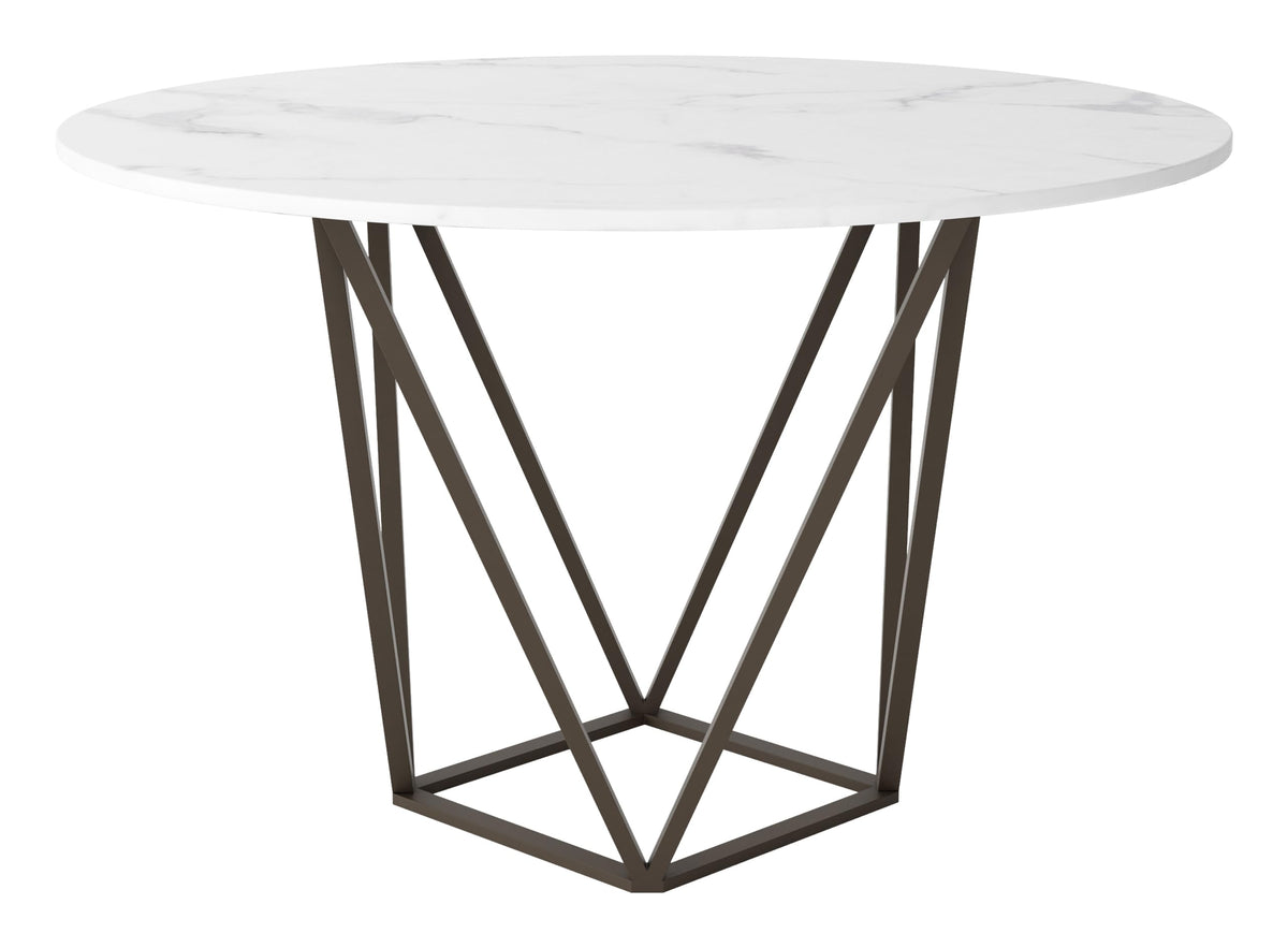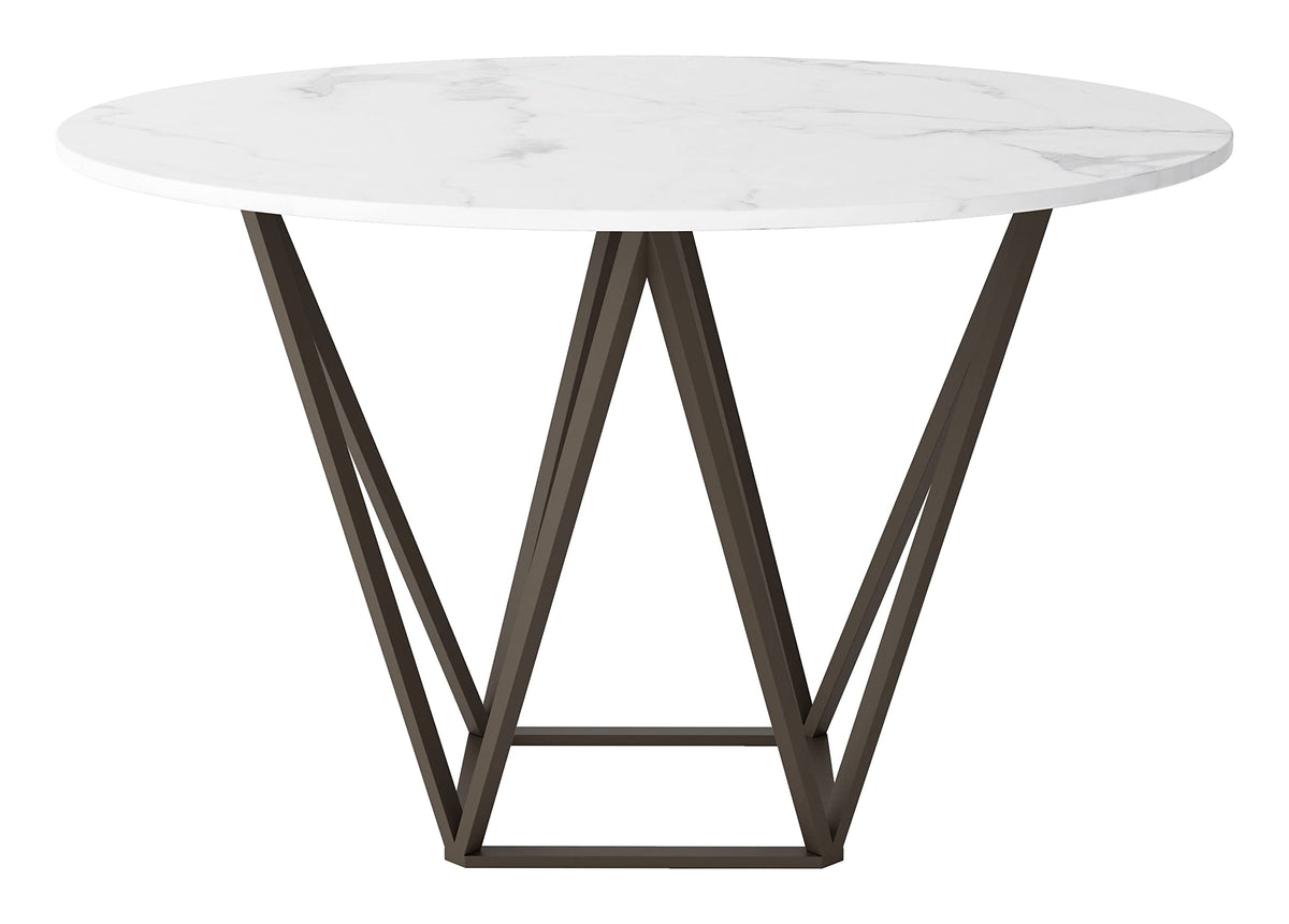 Perfect geometry. This gorgeous dining table with its smooth round marble-like top, rests on an architecturally inspired steel base for a look that is timeless. Its modern open air design is perfect for small spaces. The substantial surface with a slightly tapered base will seat four comfortably.
