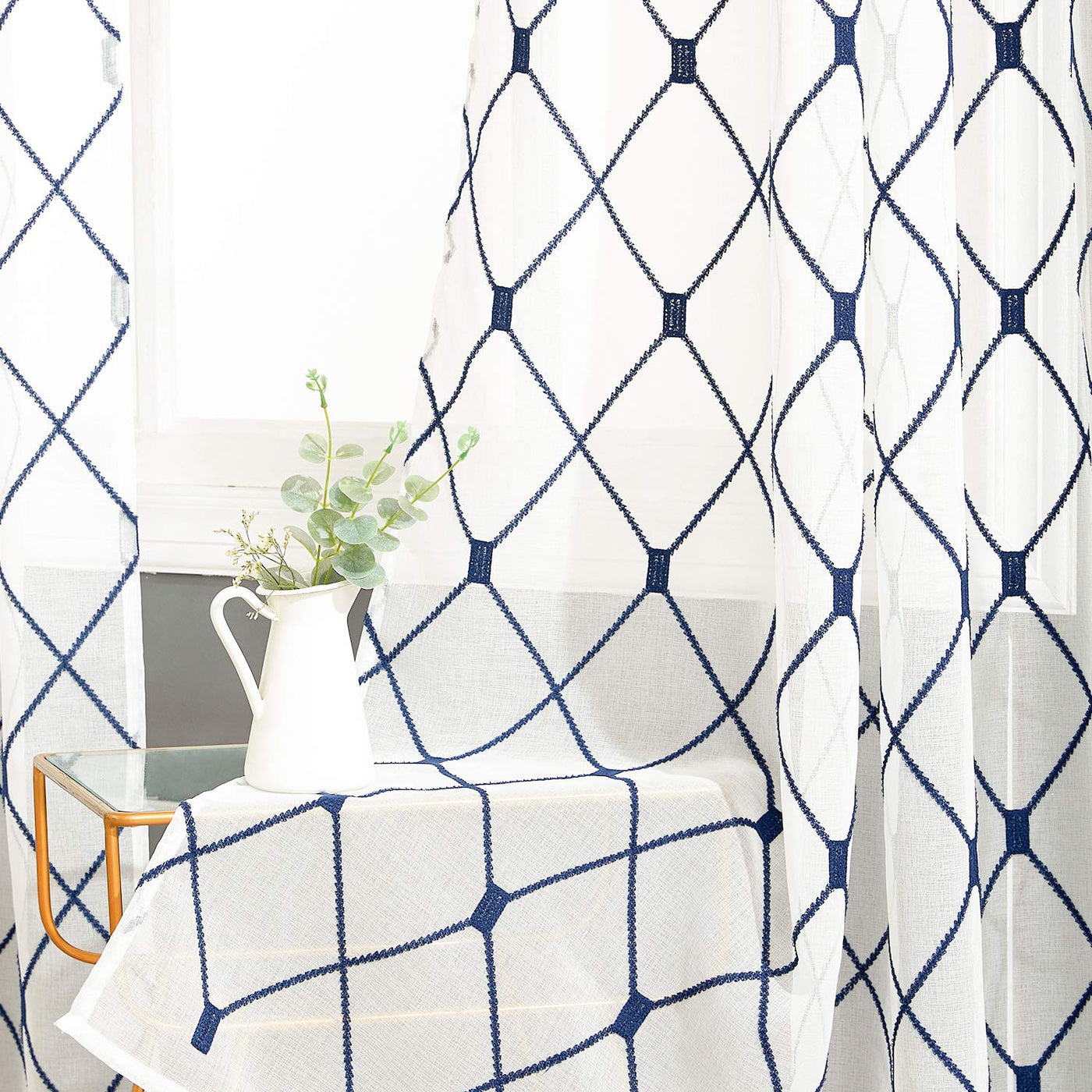 Top Finel White Short Sheer Curtains 54 Inch Length Navy Embroidered Diamond Grommet Window Curtains For Living Room Bedroom, 2