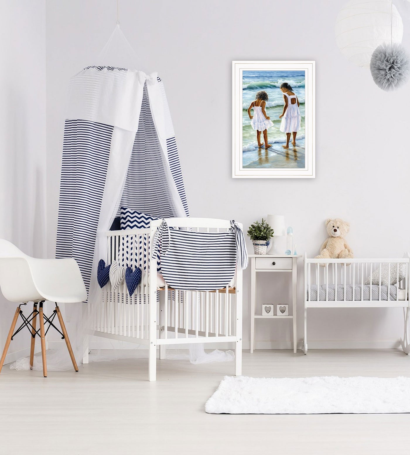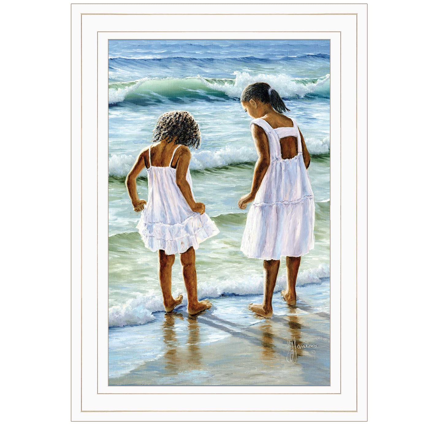 Unique and decorative, this two girls at the beach 2 white framed print wall art will leave a lasting impression. This print is a visual artistic expression that allows you to decorate your space in style. Reproduced for you on paper, this hanging accent will be a trendy and fashionable way to dress your Hang on your wall to add some up to fashion date and decoration. Utilize this opportunity to create a focal point in the room with this wonderful wall option. 5' H x 1 1' W x 1' D