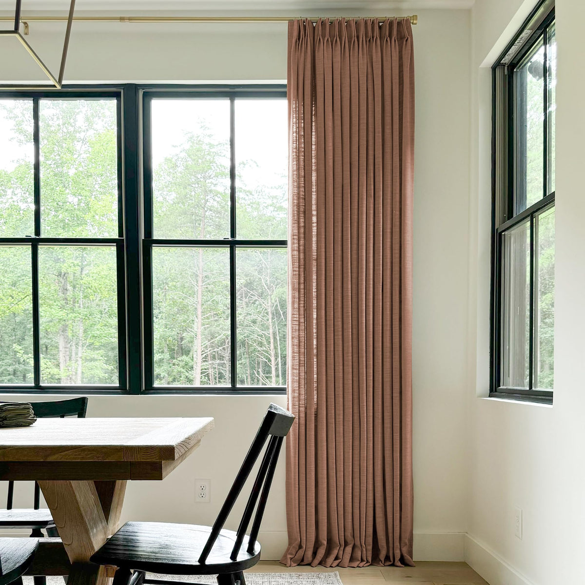 Q: What material is used in the TWOPAGES Pinch Pleated Drape?A: The curtain is made from a blend of 10% linen and 90% polyester, resulting in a durable and heavy fabric that has a textured, natural look while ensuring elegance and casual comfort in your room.
