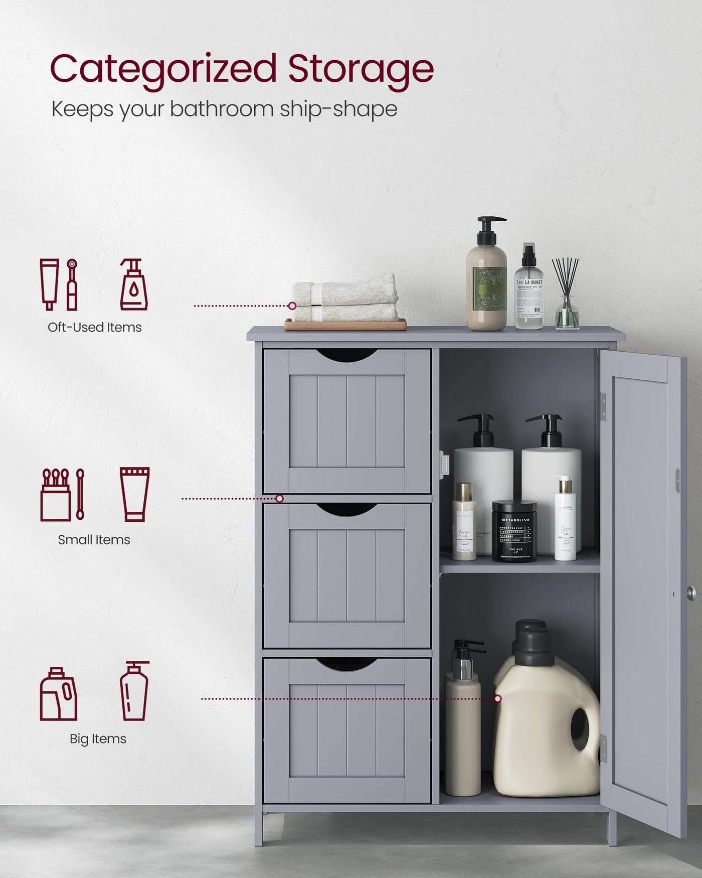 [Spacious yet Space-Saving] Sized at 11.8'D x 23.6'W x 31.5'H, this bathroom storage unit occupies a small footprint while offering lots of storage. With this unit, you can utilize your bathroom space to the max | [Sturdy, Stable, and Safe] Made of robust MDF, this bathroom storage cabinet is sturdy and stable; the anti-tip kit hidden on the back of this storage cabinet adds to the overall stability and safety | [Adjustable Shelf] This bathroom storage unit comes with 1 adjustable shelf (3 height options) behind the door, allowing you to organize both tall and short items and keep them away from dust | [Beautiful Addition to Any Room] Elegant dove gray color, combined with unique beadboard-style cabinet, make a stylish storage unit that fits in easily with your home decor, whether it’s your bathroom, living room, or entryway | [Easy-Peasy Assembly] Never worry about assembly! Numbered parts and easy-to-follow instructions make this freestanding bathroom cabinet a breeze to assemble