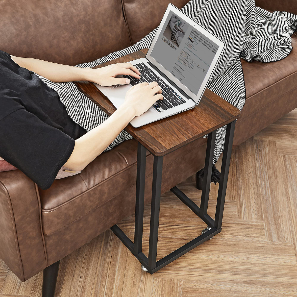 C-Shaped Design: this end table can easily hug the side of your sofa or chair; you can also tuck it under your bed for more convenient use.Assembly Required.Material:Engineered Wood;Alloy Steel.Item Dimensions:19.7' L x 13.8' W x 23.6' H | Multiple Functions: This end table boasts a large tabletop sized 19.7”L x 13.8”W and a reasonable height of 21.7” (without wheels), which works wonders for laptop, dining, or as an occasional table | Durable & Sturdy: The mix of durable particleboard and sturdy steel frame of this side table provides long-lasting durability and sturdiness; the rounded corners of the tabletop ensure safe use | Easy-Peasy Assembly: With a simple structure, numbered parts, and illustrated instructions, you’ll have this industrial side table assembled in a snap | With Wheels or Feet: In addition to 4 wheels, 4 adjustable feet are also included in the scope of delivery, so you can choose to mount the wheels for easy mobility, or use the adjustable feet to keep it in place
