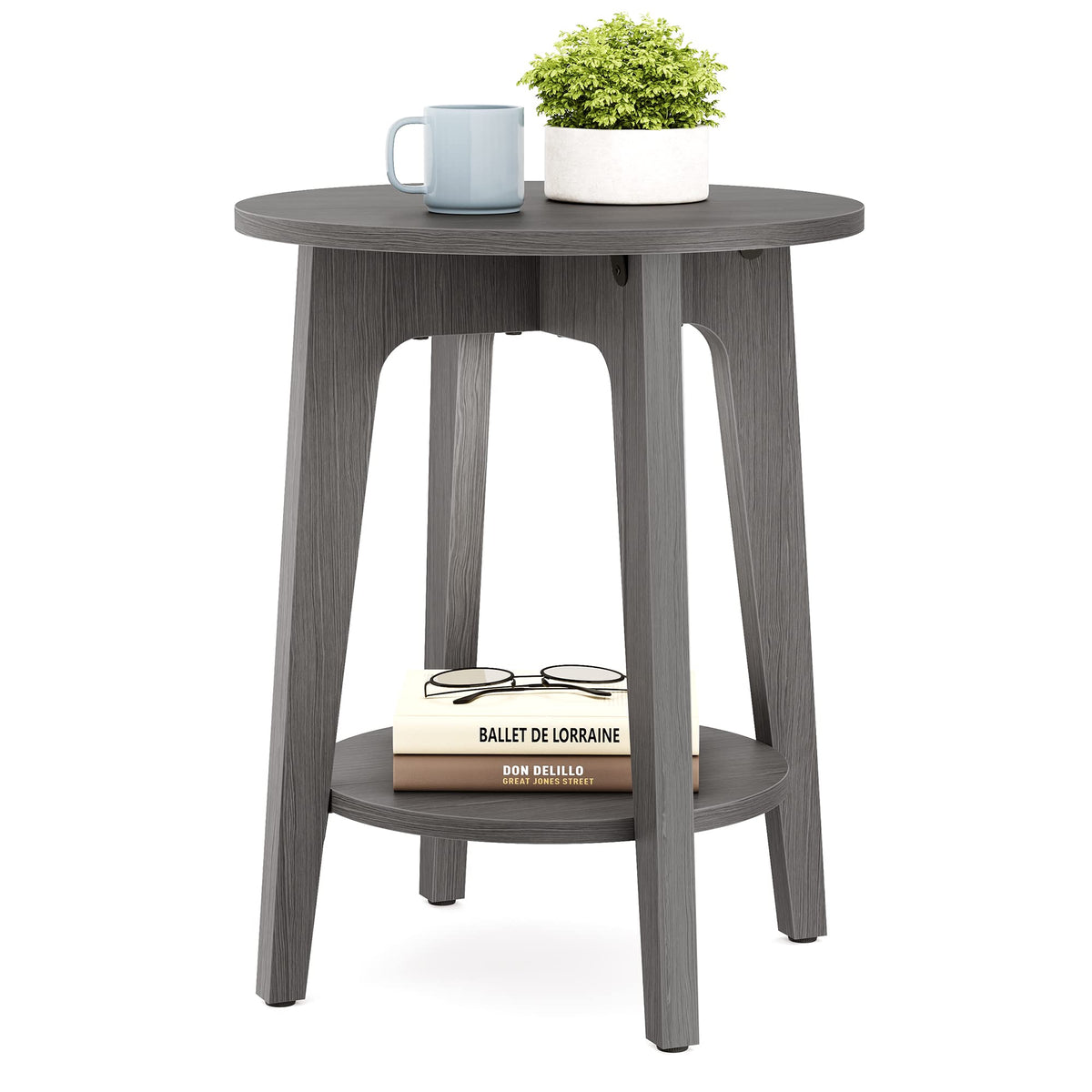 [Modern Vibe] The round tabletop, smoky gray finish, and angled legs merge on this small side table, adding a clean, sleek modern vibe to your living space | [2-Tier Storage] The tabletop is spacious to place an elegant flower vase, a cup of coffee, or a stack of books, and the lower shelf is perfect to display your mementos | [Built with Strength] Made with quality particleboard and thick legs, this nightstand table boasts a stable, sturdy structure and can hold up to 198 lb in total | [Space-Saving and Versatile] Sized at 15.8”Dia. x 19.7”H, this space-saving end table will be a lovely fit next to an armchair or couch, or make a drink table, a bedside table, or a beautiful plant stand | [Quick Assembly] Set up your end table in about 10 minutes! Follow the clear instructions, connect the labeled parts to a simple structure, and you’re done!