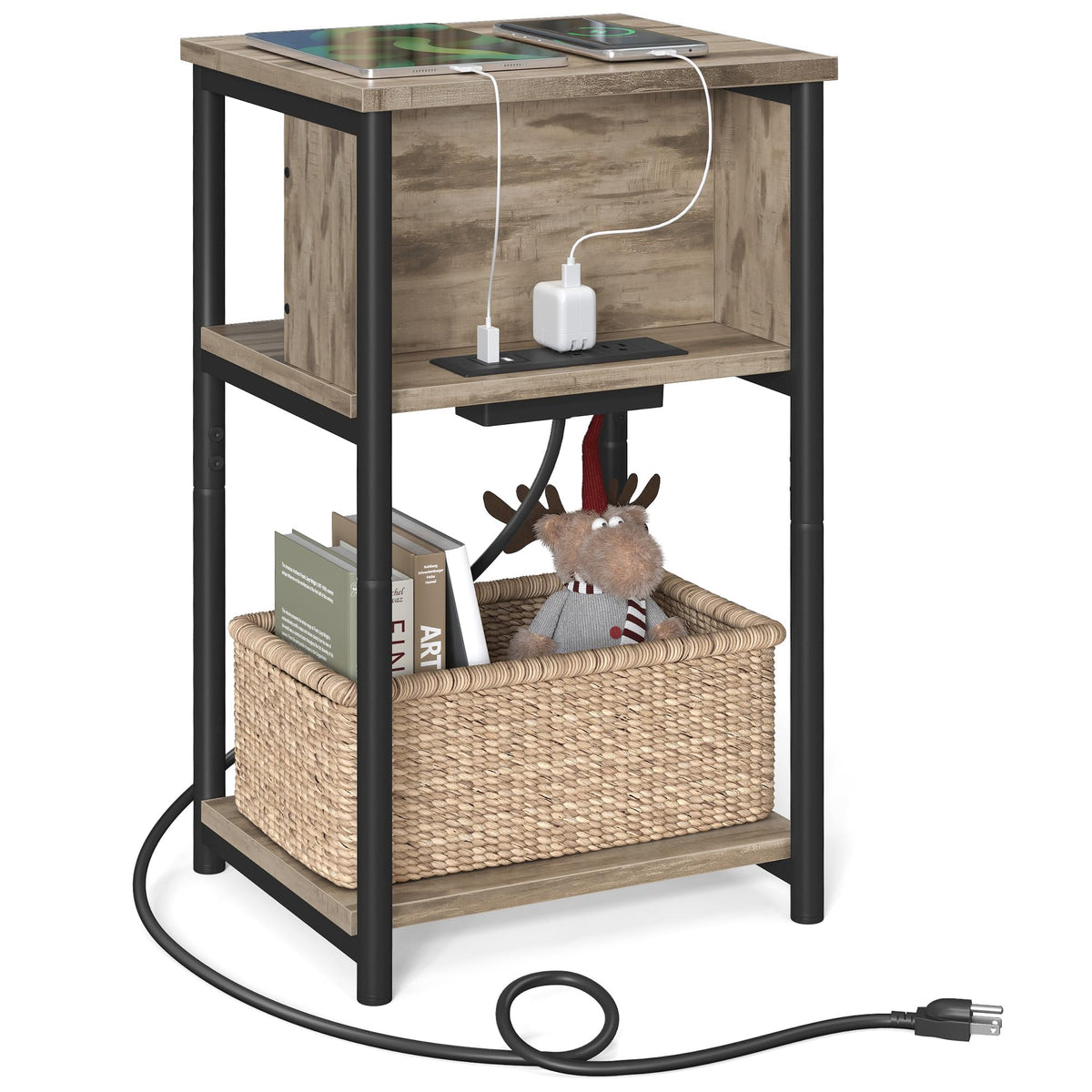 [Side Table with Charging Station] With 2 AC outlets, 2 USB ports, and a 6.5 ft long cord, this end table allows you to charge your devices conveniently, so you don’t need to go looking for an outlet when your battery is low | [Well-Considered Details] The horizontal power panel allows easy access to the outlets; the gap between the power panel and the table top allows the cables to go through for a tidy look | [Tidy Up Your Sofa Corner] A lamp on the top surface, a remote on the middle shelf, and a stack of books on the bottom shelf—keep your necessities well organized with this 3-tier side table | [Stable and Strong] With a robust steel frame, premium particleboard panels, and adjustable feet, this side table will support items firmly and reliably (max. load 22 lb for table top, 22 lb for each shelf) | [Fits Tight Spaces] Sized at 11.8”D x 13.4”W x 22.8”H, this slim end table perfectly fits the small spaces between two upholstered rockers or beside the bed