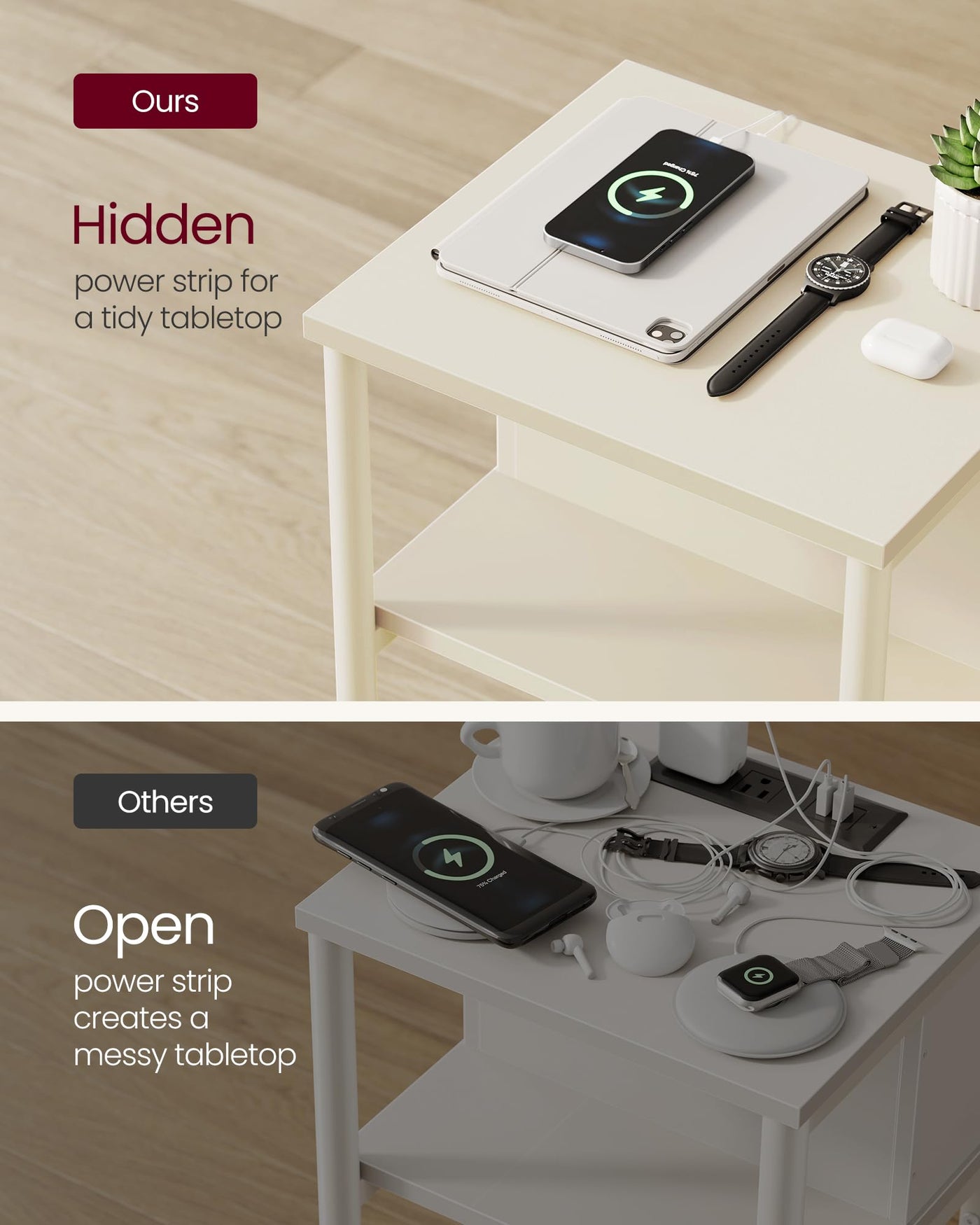 Vasagle Side Table With Charging Station, 3-Tier End Table With Usb Ports And Outlets, Nightstand For Living Room, Bedroom, 11.8 X 13.4 X 22.8 Inches, Plug-In Series, Cream White