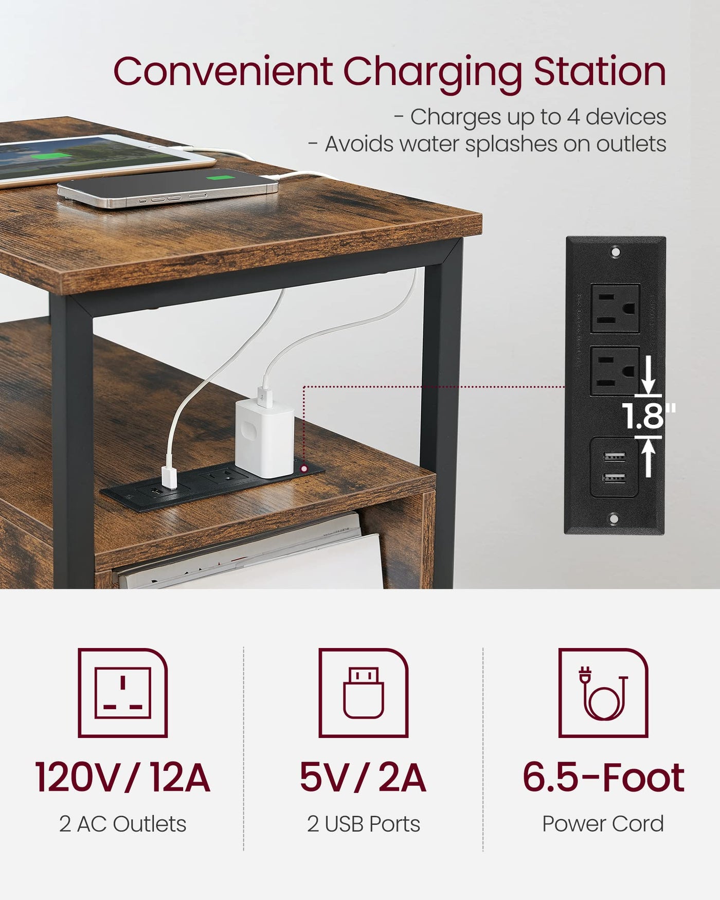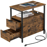 [Attached Power Strip] Power up your devices with our side table featuring a built-in charging station with 2 AC outlets, 2 USB ports, and a 6.5 ft cable, keeping your space organized and free from messy cords | [Plenty of Storage] This narrow side table features 2 drawers with removable inner dividers, 2 open shelves for easy access, and a convenient magazine holder on the back, providing ample storage space for your books and electronics | [Stable and Durable] Constructed with steel and particleboard, this slim nightstand will provide sturdy and reliable support (max. static load 200 lb) for your bedside essentials in the coming years | [Thoughtful Additions] Designed with thoughtful details such as stylish easy-to-grab handles and smooth drawer slide rails, this end table brings convenient utility right by your bedside | [Bring Rustic Charm to Any Room] This narrow bedside table can serve as a sofa side table, nightstand, or accent table. Its rustic design will add a touch of charm to your living room, bedroom, or wherever you need it