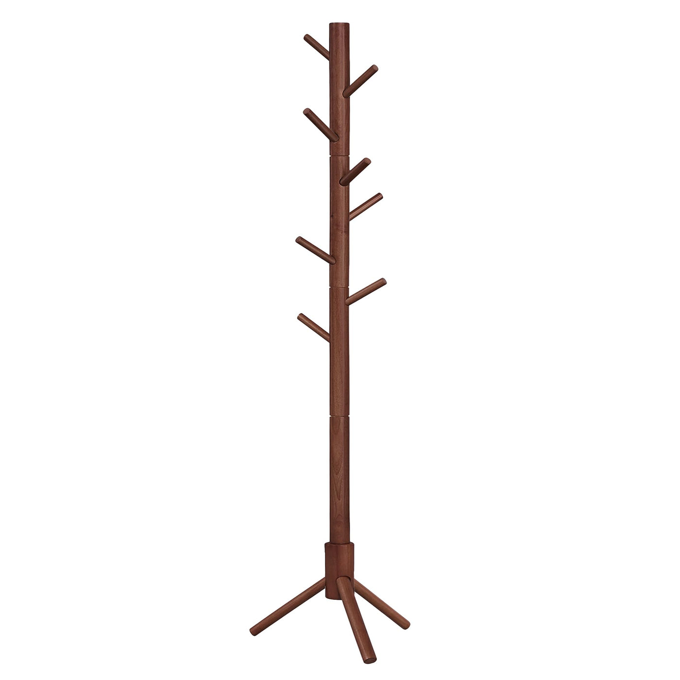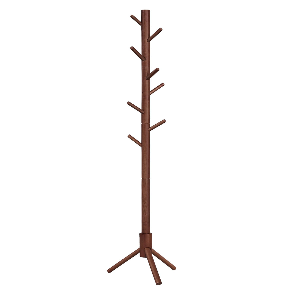 Specifications: - Color: Dark Walnut - Material: Solid Wood - Product Size: 18.5”D x 18.5”W x 68.9”H (47 x 47 x 175 cm) - Length of Each Hook: 4.8” (12.3 cm) - Product Weight: 4.9 lb (2.2 kg) - Max. Static Load of Each Hook: 6.6 lb (3 kg) - Total Max. Static Load: 53 lb (24 kg) Package Contents: - 1 x Coat Rack - 1 x Instructions VASAGLE Notes: - Do not expose the coat rack to direct sunlight for a long time. - Do not touch the standing coat rack with sharp objects.