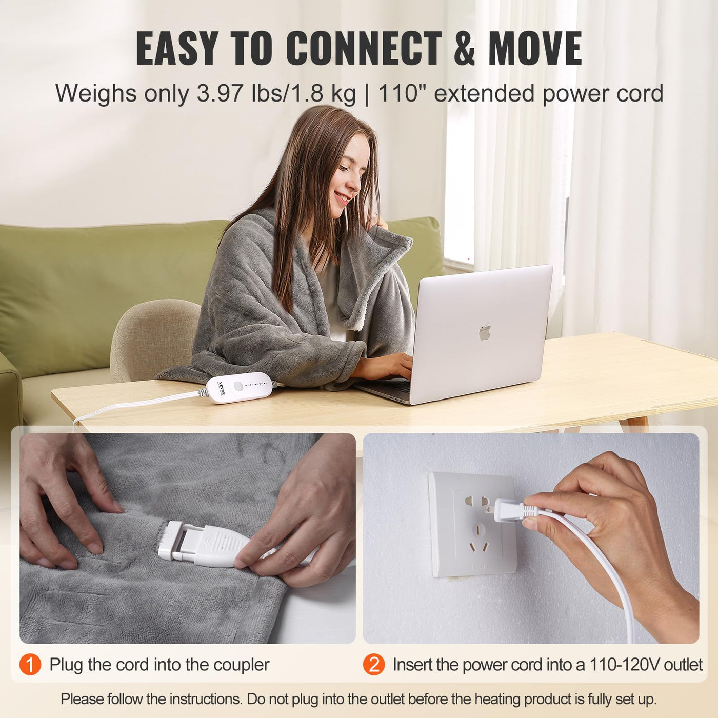 Even Heating From Every Angle: Dive into the warmth that's spread consistently throughout! Our heated blanket features uniformly distributed heating wires. This unique design speeds up to that cozy temperature, ensuring every spot is as toasty as the next. | Softer Than a Cloud: The electric blanket is crafted from soft and comfortable material. Imagine being wrapped in a gentle hug on those frosty days. That's our blanket for you, a delightful mix of comfort and warmth. | Your Warmth, Your Way: This heating blanket is equipped with an easy-to-use controller. From a light toast to super snug, choose from our 5 quick heating settings catering to various needs. Tailor-made warmth for every cold day and every mood! | Security First, Always: Sleep easy, knowing we've got your back. With ETL and FCC nods, our heated throw blanket boasts top-notch security features to keep things just right. It has built-in overheat protection and over-voltage protection systems. No overheats or nasty surprises here! | From Bed to Desk: Whether you're curling up for a movie night or need that extra warmth during a long workday, this heat blanket's got you covered. Plus, its multi-functional design and comforting warmth make it a heartwarming gift for just about anyone.