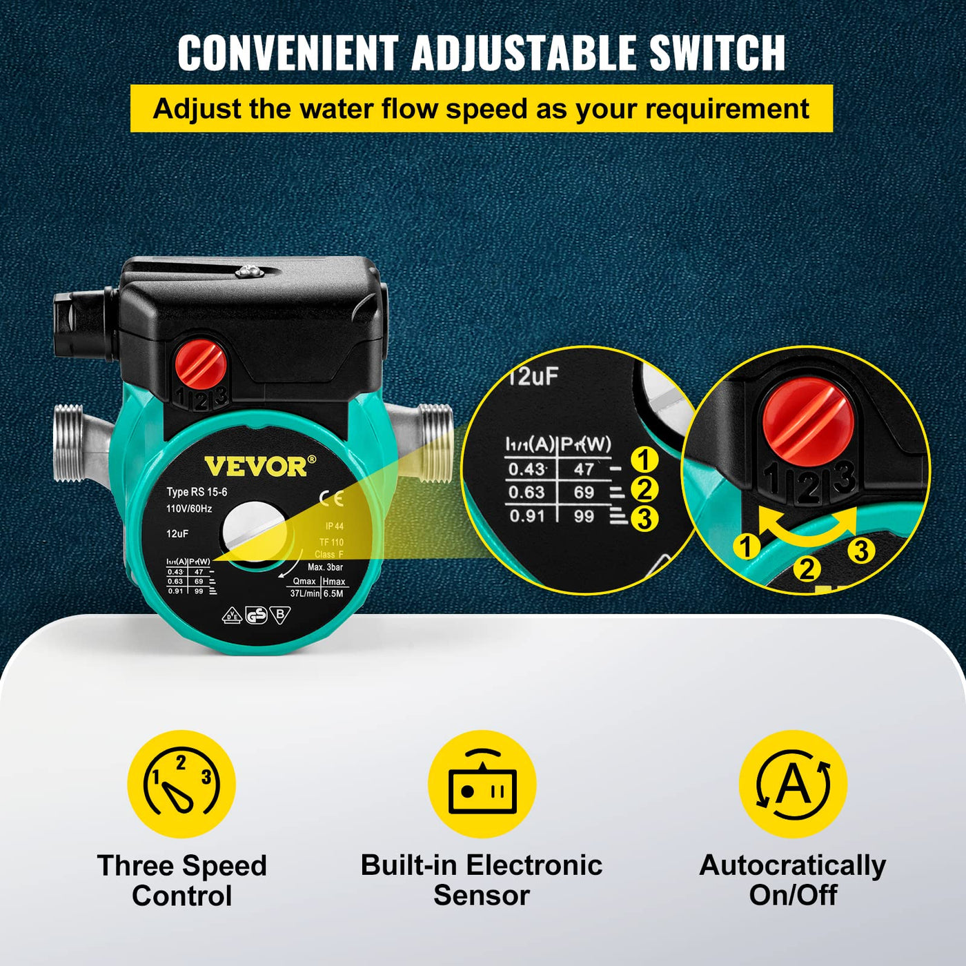 Vevor Hot Water Recirculating Pump, 93W 110V Water Circulator Pump, Automatic Start Circulating Pump Npt 3/4'' W/Brass Fittings,