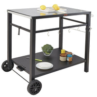 Highlights:1.Multifunctional Bbq Station: A Bbq Movable Food Prep Table That Can Be Used Both Indoors And Outdoors. In Addition To Being Used As A Barbecue Table Or Pizza Oven Stand, It Can Also Be Used For Food Preparation, Storage, Outdoor Dining, And More, Catering To Your Various Outdoor Cooking Needs.2.Premium Stable Material: Constructed With Extremely Durable Materials, The Cart Body Is Built To Last And Resistant To Easy Damage. Additionally, It Is Effortless To Clean, Allowing You To Wipe Away Dust And Stains With Ease. Furthermore, Our Tabletop Edges Have Been Meticulously Polished, Not Only For Aesthetics But Also To Prevent Any Risk Of Cuts Or Injuries To Your Hands.3.Double-Layered Shelves And Abundant Accessories: The Double-Layered Shelf Structure Is Designed To Provide Sufficient Storage Space For Your Pizza Oven, Firewood, Barbecue Grill, Or Cooking Equipment. Portable Modular Cart Is Equipped With 4 Hooks That Can Be Used To Hang Kitchen Accessories And Various Tools. Additionally, We Have Prepared A Pvc Table Mat, Paper Towel Holder, Knife Rack, Gas Canister Holder, And Bottle Opener To Make Your Usage More Convenient.4.Superior Load-Bearing Capacity: Compared To The Blow-Molded Wheels Used By Most Similar Products On The Market, We Have Upgraded To Higher-Quality Injection-Molded Wheels, With A Weight Of 130G Per Wheel, Providing Superior Load-Bearing5.Capacity. The Panel Can Dynamically Bear A Weight Of Up To 110 Lbs.Details: Double-Shelf Outdoor Grill Dining Cart It Can Be Used As A Barbecue Table Or Pizza Oven Stand, It Can Also Be Used For Food Preparation, Storage, Outdoor Dining, And More. It Provides A Convenient And Practical Workstation For Outdoor Cooking. Constructed With Extremely Durable Materials, The Cart Body Is Built To Last And Resistant To Easy Damage. Additionally, It Is Effortless To Clean, Allowing You To Wipe Away Dust And Stains With Ease. Designed With A Double-Tiered Shelf, Outdoor Prep Cart Can Store Large Kitchen Equipment. Additionally, We Have Prepared Four Hooks, A Pvc Table Mat, Paper Towel Holder, Knife Rack, Gas Canister Holder, And Bottle Opener To Make Your Usage More Convenient. Our Wheels Are Crafted Using High-Quality Injection Molding Technology, Offering Superior Load-Bearing Capacity Compared To The Blow-Molded Wheels Commonly Used In Similar Products On The Market. The Package Includes Clear Installation Instructions And A Parts List, Making Assembly A Breeze Without The Need For Additional Tools Or Manpower. It Saves You From Dealing With Tedious Installation Procedures, Allowing You To Enjoy A Stress-Free Experience.