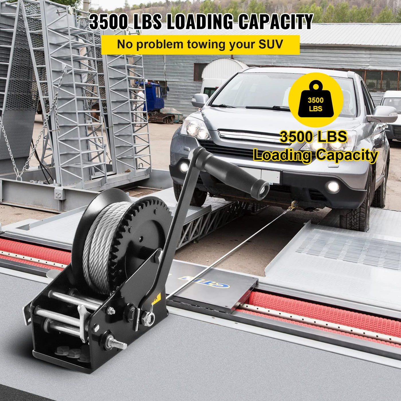 VEVOR Hand Winch3500 LBS Loading Capacity & 33 FT Cable & GalvanizedOur hand winch has been galvanized to resist rust and corrosion. The heavy-duty hook and 6 mm wire rope provide the winch with a 3500 lbs loading capacity---enough to meet the needs of 95% daily towing jobs, such as towing an SUV or a boat.key FeaturesReliable Hand WinchOur hand winch is a powerful tool for loading or towing boats, lawn equipment or lifting heavy objects. With this winch, you can greatly improve your work efficiency.High-quality MaterialThe hook and the gears are made of heavy-duty 45# steel, so they can resist deformation and wear. The surface is made of galvanized steel, so it can resist rust and corrosion.Forward & ReverseThis manual winch with hook is equipped with a two-way