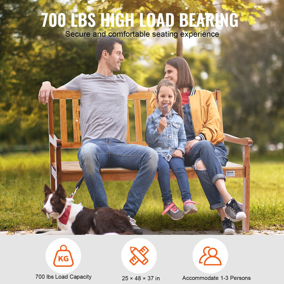 Built for the Outdoors: Crafted from high-quality solid wood, this outdoor park bench is designed to withstand long-term outdoor use and various weather conditions. It resists corrosion, deformation, and damage, supporting up to 700 lbs / 318 kg to accommodate users of different sizes. | Superior Comfort: Our garden bench is meticulously designed for comfort, with a backrest angle of over 90° for relaxed leaning, and streamlined armrests to support your arms, helping you unwind from a long day. | Easy Assembly: We provide all necessary accessories and detailed step-by-step instructions to ensure you can assemble the patio bench in just 15 minutes. | Versatile Style: The natural wood grain exudes a touch of nature. Our porch bench seamlessly blends into modern, Nordic, industrial, and various other decor styles, adding unique charm and taste to your home. | Spacious Seating: With overall dimensions of 25 x 48 x 37 inches, this outdoor garden bench can comfortably seat 1-3 people, making it ideal for gardens, parks, patios, or porches to enjoy the tranquility of nature and relax.