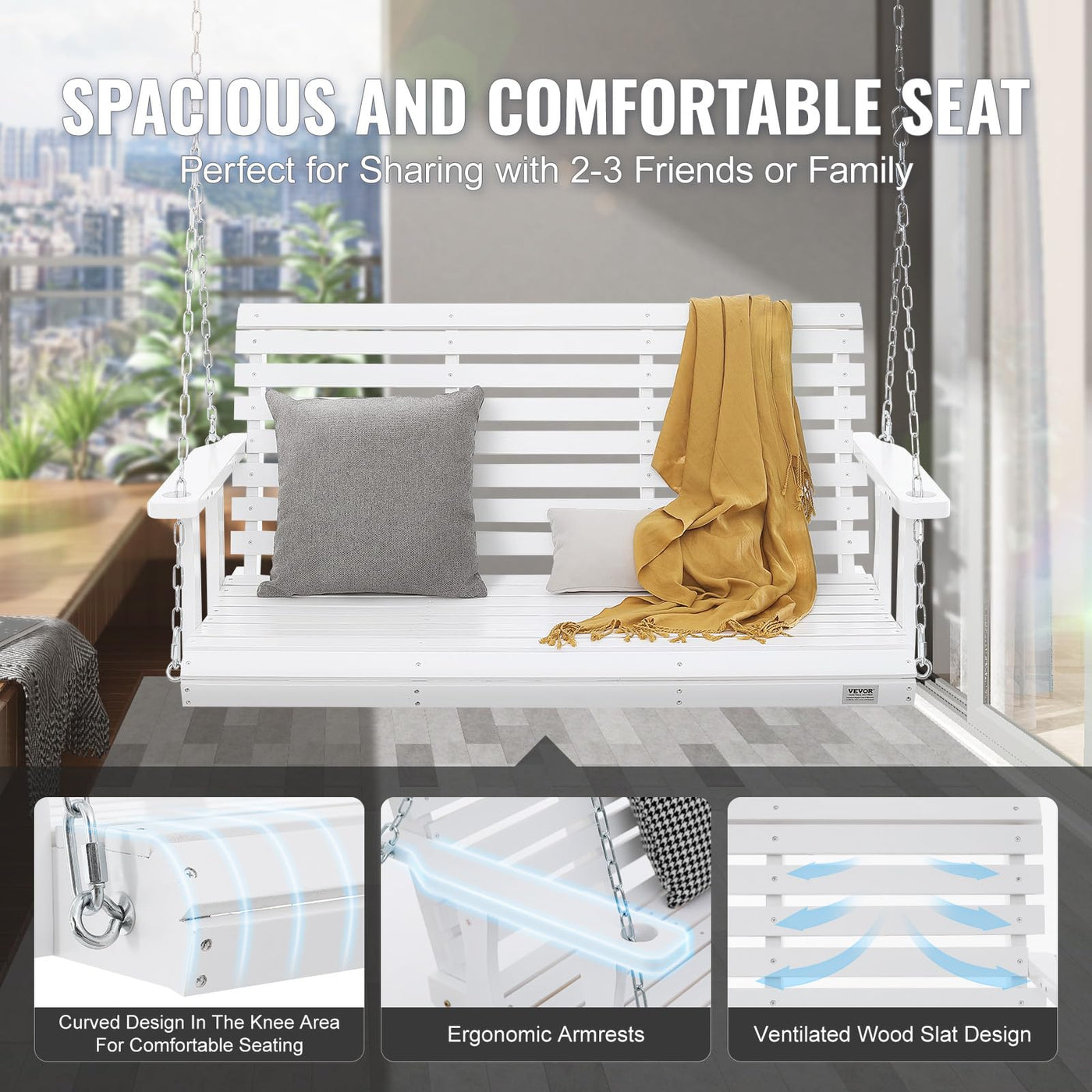 Vevor Wood Porch Swing 4.5Ft, Patio Bench Swing For Courtyard & Garden, Upgraded 880 Lbs Strong Load Capacity, Heavy Duty Swing Chair Bench With Hanging Chains For Outdoors, White