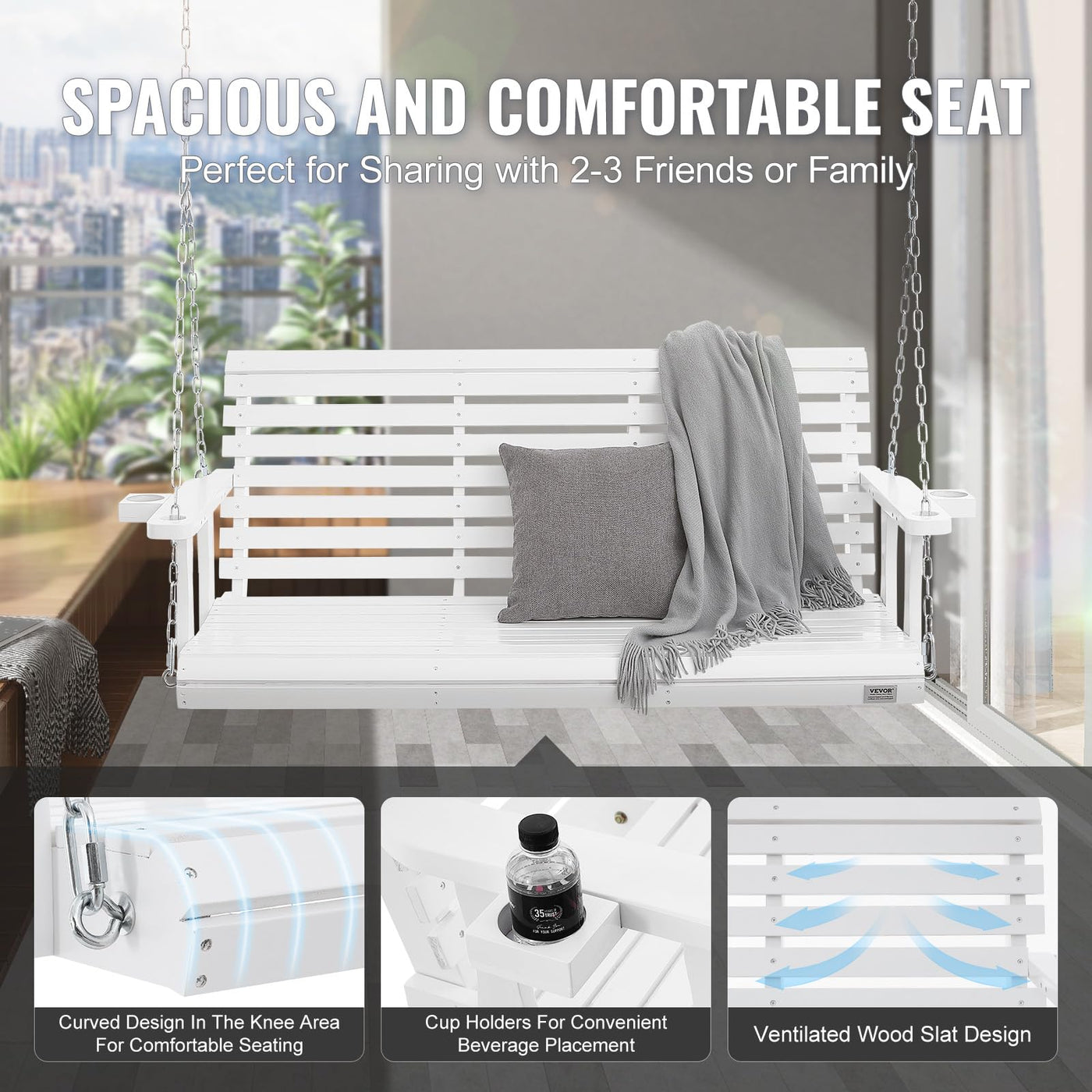 Vevor Wooden Porch Swing 5.5Ft With 2 Side Cup Holders, Heavy Duty 880Lbs Patio Swing, Outdoor Swing Hanging Chair, Bench Swing With Adjustable Chains For Front Porch, Yard, Balcony, Garden, White