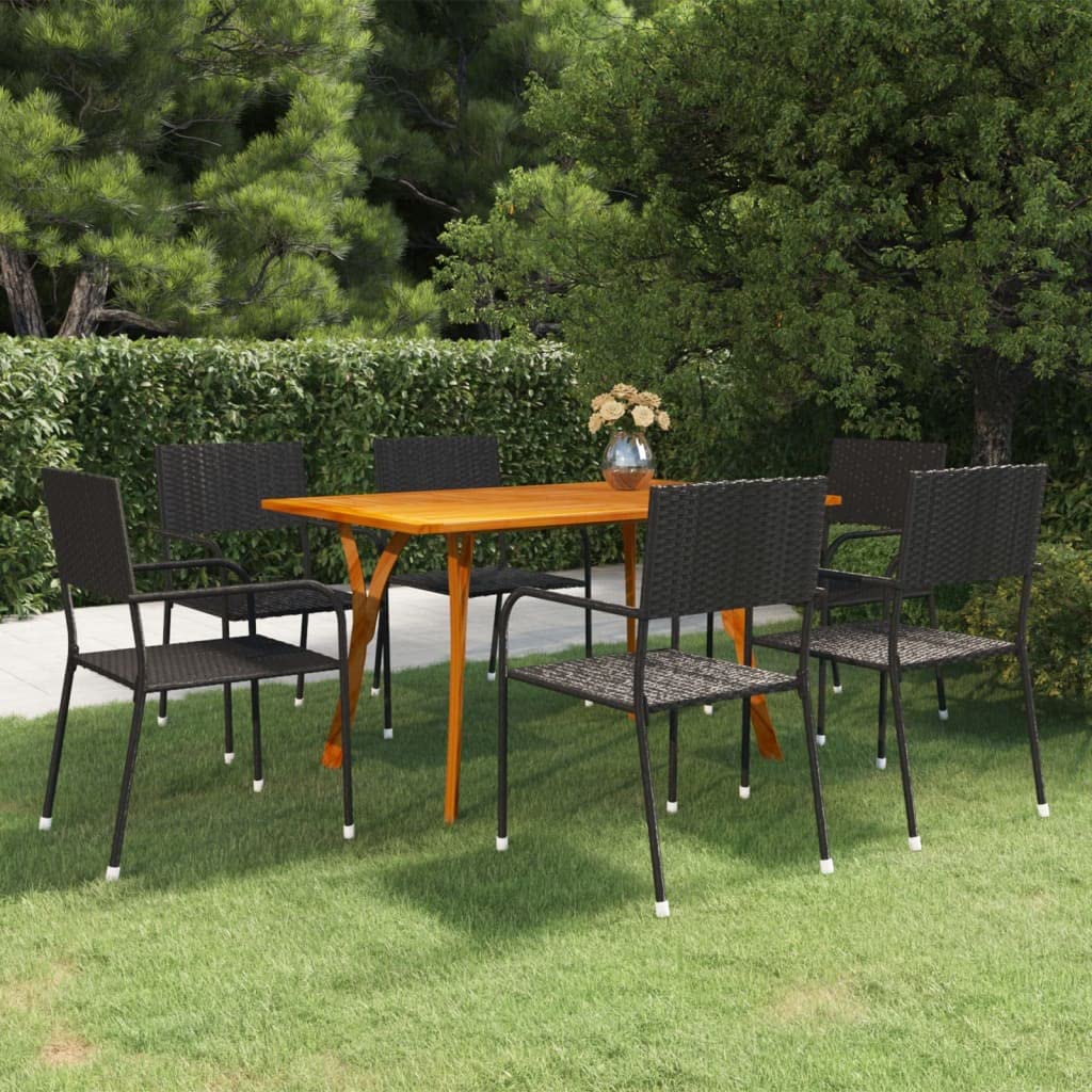 vidaXL Modern 7 Piece Patio Dining Set - Solid Acacia Wood Table with Oil Finish, 6 PE Rattan Chairs - Black, Weather-Resistant Outdoor Furniture