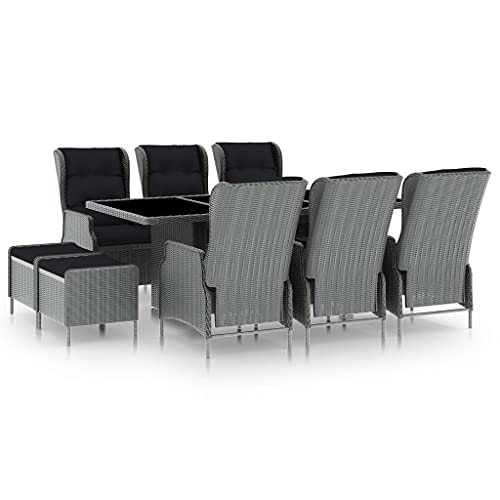 vidaXL Modern 9 Piece Patio Dining Set with Cushions, Reclining Chairs and Footstool, Poly Rattan and Powder-Coated Steel Frame, Light Gray, Outdoor Furniture