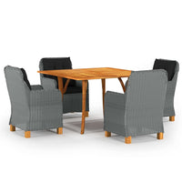 Create a convincing and cohesive aesthetic in your outdoor area with this garden dining set. The garden table is made of solid acacia wood, which makes it robust and stable. Thanks to the oil-treated surface, the table can also be easily cleaned with a damp cloth. In addition, the curved legs contribute to its stylish design. With a steel frame woven with weather-resistant PE rattan, the dining chairs are robust and easy to clean. The thick padded cushions provide extra comfort when relaxing. Note: To prolong the life of your garden furniture, we recommend that you clean it regularly and cover it when not in use outdoors.Cleaning: use a mild soap solutionStorage: if possible, store in a cool, dry place indoors. If the product is stored outdoors, protect it with a waterproof cover. Wipe and dry the excess water or snow after rain or snow from flat surfaces. Ensure sufficient air circulation to avoid moisture-related damage. Table top thickness: 2 cm Chair: Colour: light grey Cushion colour: black. Material: round PE rattan, solid acacia wood, powder coated steel Cushion material: 100% polyester cover with foam filling. Overall dimensions: 62 x 65 x 92 cm (W x D x H). Seat width: 54 cm. Seat depth: 49 cm Seat height from the ground: 41 cm. Armrest height from floor: 64 cm. Seat cushion thickness: 6 cm. Back cushion thickness: 10 cm. Assembly required: yes. Package includes: 1 x table. 4 x chairs. 4 x seat cushions.