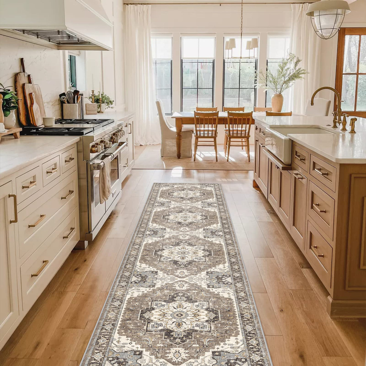Q: What types of rooms is this rug suitable for?A: This rug is versatile and can be used in various high traffic areas of your home, including the living room, dining room, kitchen, and hallways.