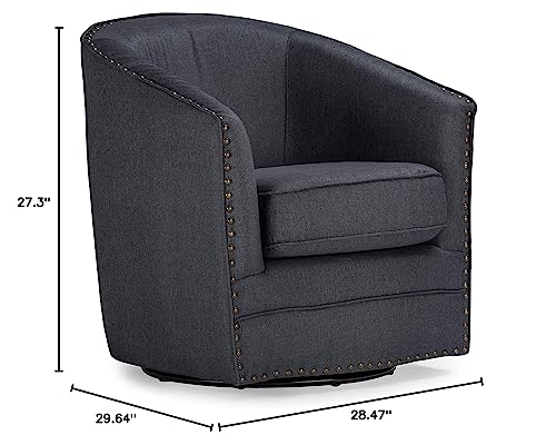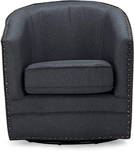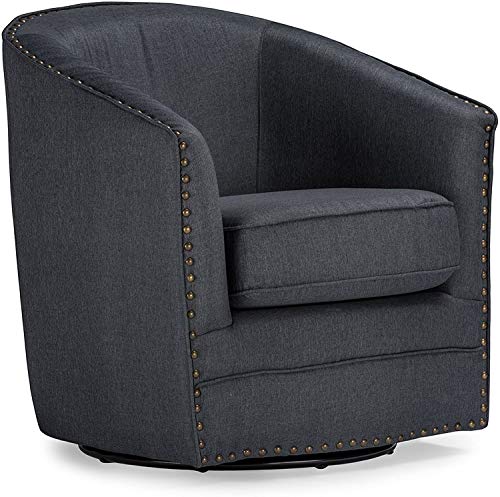 Contemporary style. Upholstered with cotton-linen blend fabric. Bronze nail heads trim design. Shelter style back. Swivel base with puffy cushions. Made from wood and foam. Made in China. No assembly required. Seat: 20.28 in. L x 18.72 in. W x 17.55 in. H. 28.47 in. W x 29.64 in. D x 27.3 in. H (53.9 lbs.).