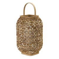 Lantern 16''H Wicker/Glass Welcome your guests with this boho-chic Wicker Lantern. The natural wicker finish paired with the intricate woven design is the perfect combination to create a stunning display. Standing almost 1 1/2 feet tall, this lantern would make a great floor display in your porch or entryway. Great for both every day and seasonal decor, just add a real wax or LED candle to complete the look. Measures 8 x 8 x 16 Primary Materials: Wicker, Glass Reccommended for indoor and outdoor covered use only Candles sold separately