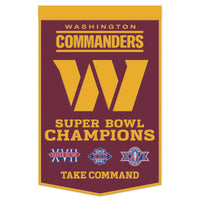 Q: What are the dimensions of the WinCraft Washington Commanders Championship Banner?A: The WinCraft Washington Commanders Championship Banner measures 24 inches by 38 inches, making it a perfect size for display.