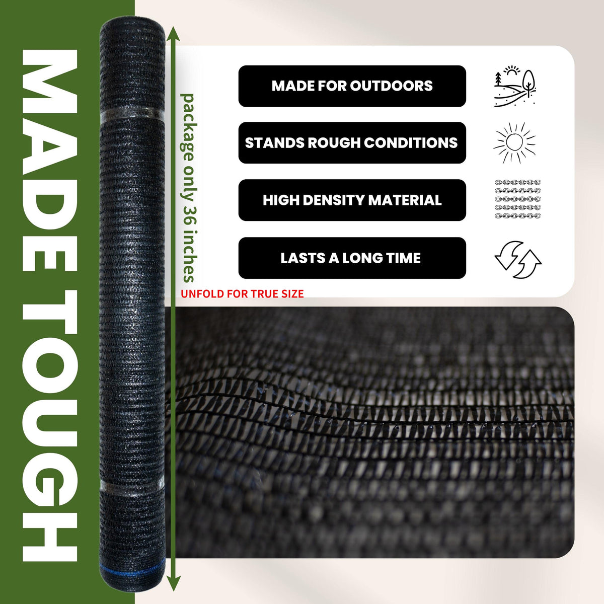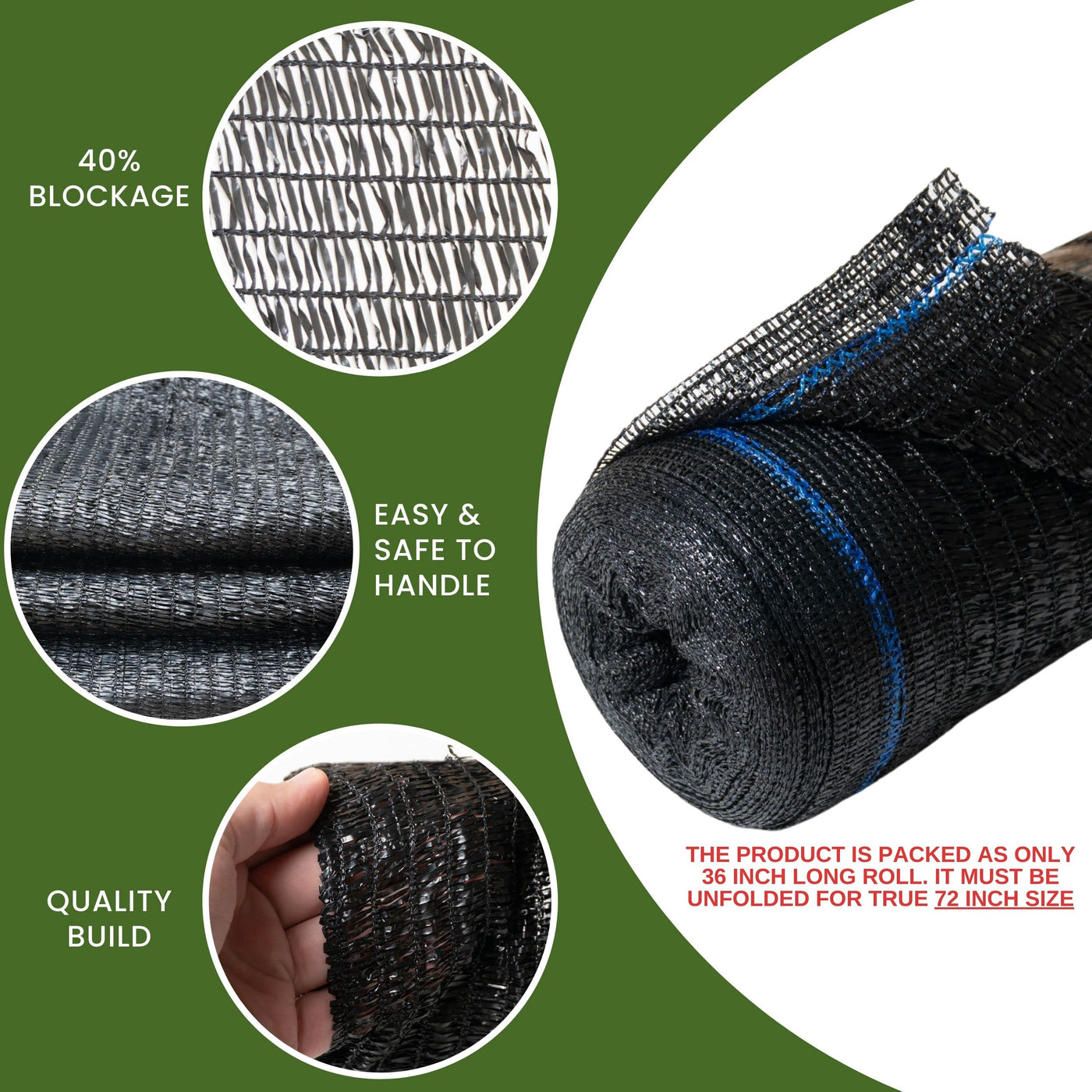 These Raw Rolls Have A 60% Blockage And Are Ideal For Greenhouse Or Anywhere You Want To Keep Cool Under. The Material Stretches Tight For A Wrinkle-Free Fit. With These Raw Rolls, You Can Easily Fold And Attach To Any Overhang Or Fence. If You Want Coverage, While Allowing Air To Pass, And At The Same Time Need Almost 60% Of Exposure, Then These Raw Rolls Are For You. We Use The Most Durable Hdpe High Density Polyethylene Material Which Can Withstand Extreme Low Or High Temperatures. Since This Roll Blocks 60% Of Light, It Allows Maximum Winds To Pass Through And Will Not Rip Or Tear.