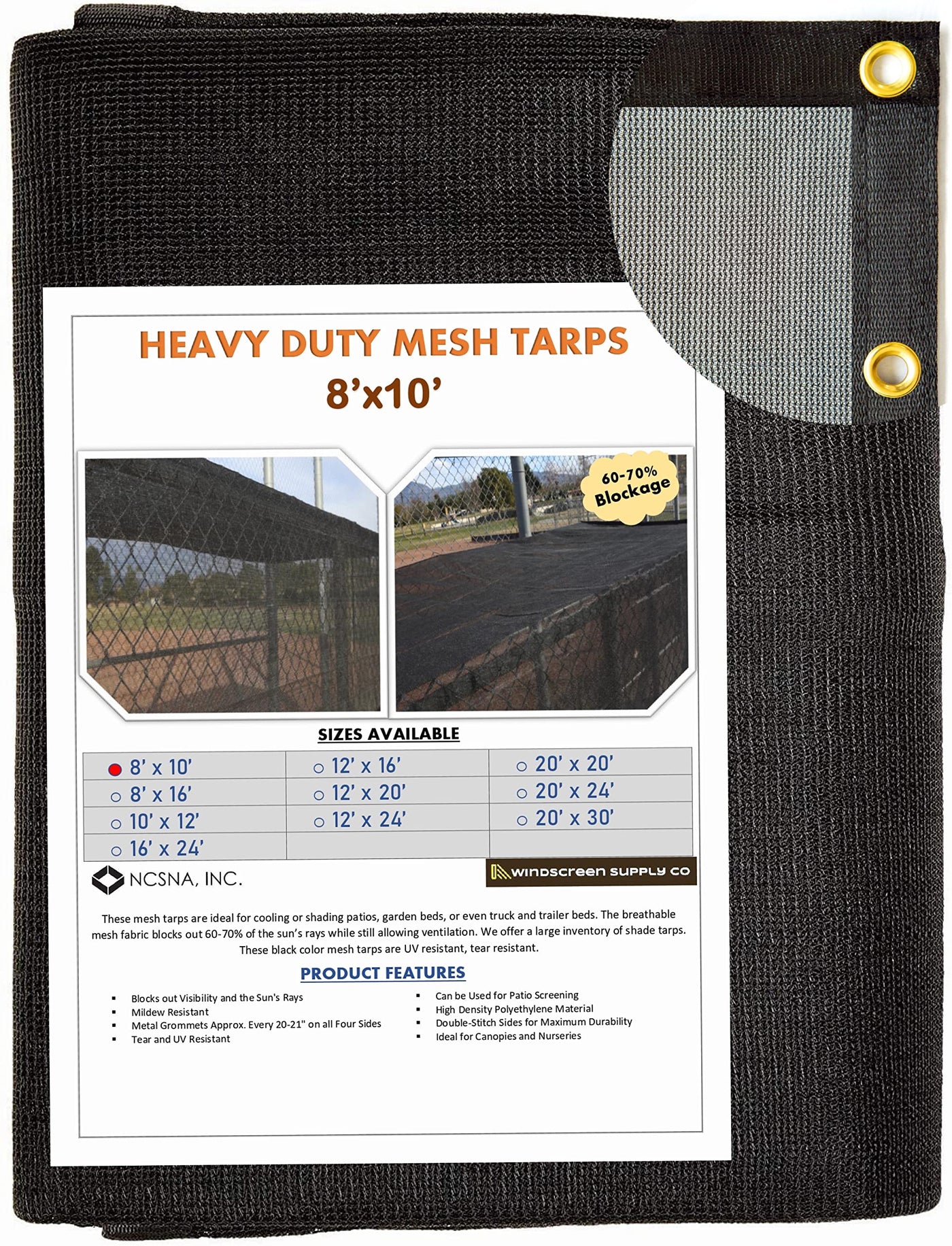 Windscreensupplyco 60-70% 8 Ft X 10 Ft Mesh Tarp/Shade Cloth 9-Needle Knitted Heavy Duty Black With Grommets For Green House, Garden, Pergola, Pools, Dump Truck