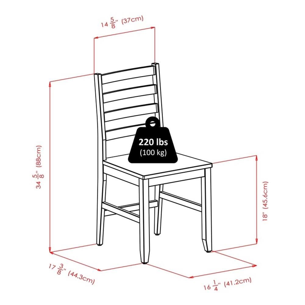 A double drop leaf table with tapered legs and two ladder back chairs with high backrest featuring 4 slats design. This set brings comfort, function and style to your dining room. The dining table has a drawer for extra storage. Drawer dimensions 7.80”W x 8.98”d x 2.07”H. Top dimensions when fully opened 41.73”W x 30.55”D, dimensions with one leaf dropped 34.76”W x 30.55”. Ladder back Seat dimensions 16.54”W x 16.46”D x 17.06”H. Weight capacity of chairs is 220 lbs. Sturdy solid wood construction. Walnut finish. Ready to assemble