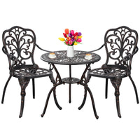 Withniture Cast Aluminum Outdoor Furniture --Specifications Material: Cast Aluminum Color: Bronze Table: F24'' X H26'' Chair: D20'' X W20.5'' X H35'' Seat:D15.4'' X W18.1'' X H16.5'' Max. Load Of Table: 200 Lb Max. Load Of Single Dining Chair: 396 Lb --Features ?All Cast Aluminium?: As All Our Patio Furniture Is Made Using A Casting Process, It Is Determined That The Aluminium We Use Is Pure And Without Impurities. ?All Weather Use?: Cast Aluminium Is Durable And Lightweight, Waterproof And Rustproof, Resistant To Uv Rays And Rain, Easy To Use And Clean. ?Exquisite Craftsmanship?: Smooth Edges Guarantee A Beautiful Bistro Set And Provide Excellent Protection From Burrs. ?Stable Construction?: Bistro Tables And Chairs Are Tested For Stability And Durability, With Good Stability And Balance. Every Screw Is In Just The Right Place For Durability. ?Adjustable Foot Pads?: Adjustable Feet Ensure That The 3 Piece Bistro Set Is Suitable For A Wide Range Of Floors And Protects Our Floors From Scratches. ?1.97'' Umbrella Hole?: You Can Enjoy A Refreshing Outdoor Meal Or Event Under The Umbrella(Not Include) And Also Decorate Your Outdoor Space. ?Easy To Assemble?: The Package Includes An Installation Manual And All The Accessories And Tools To Help You Assemble The Product Quickly, And We Can Also Send You An Assembly Video If You Required. --Wide Use The 3 Piece Patio Set Contains A Round Table And Two Chairs That Can Be Used As A Patio Bar Sets, Patio Bistro Sets, Patio Conversation Sets, Patio Dining Sets And More. For Indoor And Outdoor Use: Front Room, Living Room, Porch, Deck, Patio, Poolside, Seaside, Sun Room, Garden, Yard, Etc. For Domestic And Commercial Use: Villa, Restaurants, Cafes, Reception Rooms, Offices, Pubs, Meeting Rooms, Etc. Notes: Due To Light Or Monitor Reasons Color Will Be Slightly Different. Products Size Are Manually Measured, There Will Be 1-2 Inches Of Error, Hope Your Understanding.