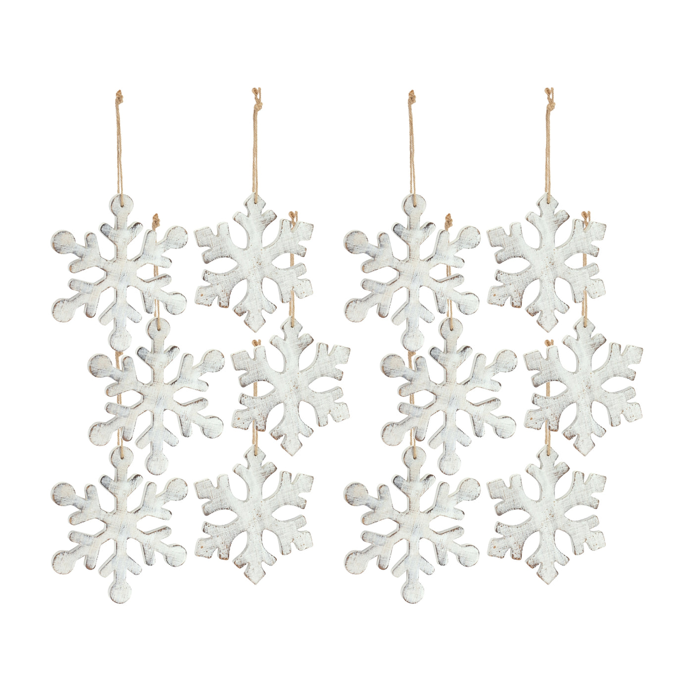 Snowflake Ornament (2 Asst) 7.5''H, 8.5''H Wood Adorn your Christmas Tree with this beautiful set of Snowflake Ornaments. Featuring two assorted sizes, the traditional snowflake design paired with the rustic white-washed finish makes this set the perfect addition to your holiday tree decor. The quality wooden composition is sure to last for seasons to come. The pieces can be used as gifts for friends to cherish, or you can display the set on your own Christmas tree and enjoy them for years to come. Measures 7 x 0.5 x 7.5 in.; 7.75 x 0.5 x 8.5 in. Primary Materials: Wood Reccommended for indoor use only Comes with a string for easy hanging