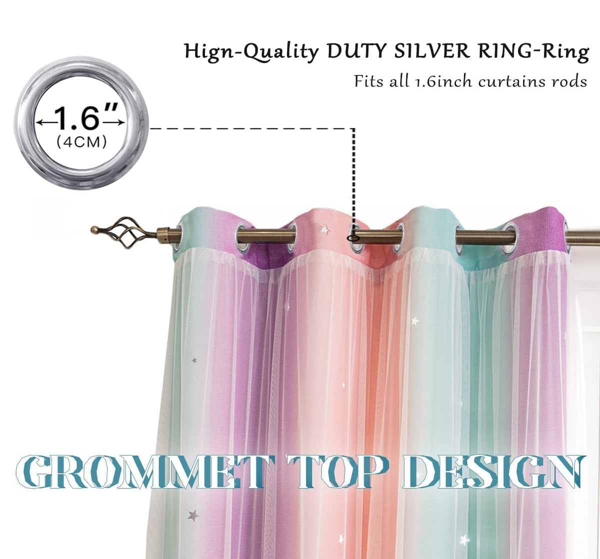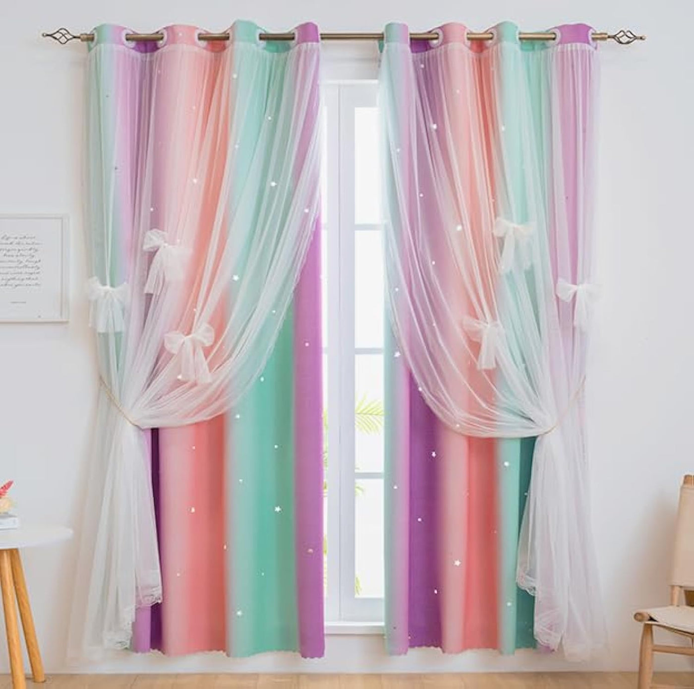 Yancorp Curtains For Girls Bedroom Kids Curtain Hollow-Out Star Window Nursery Curtain 72 Inches Length Room Darkening Grommet 2 Layers (Green Pink Purple, W52 X L72)