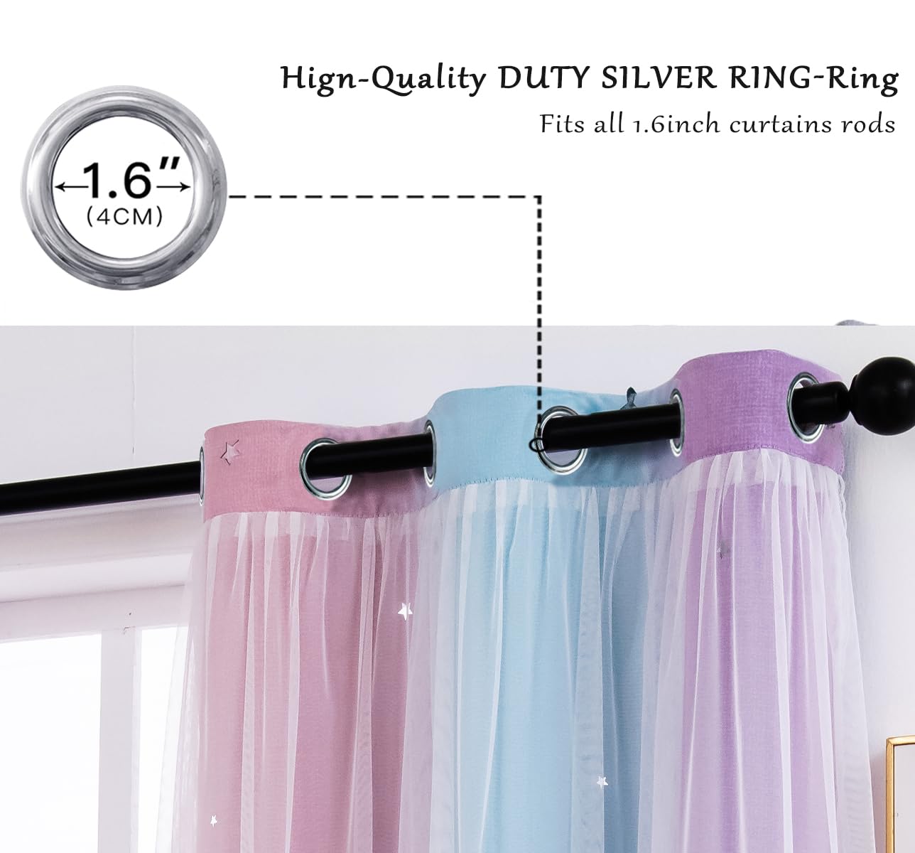 Product Description: Elevate your little girl's room décor with our enchanting girls' curtain. This two-layered curtain features a unique design that combines a blackout curtain panel with a delicate sheer layer adorned with star-shaped cutouts. The outer layer is crafted from elegant tulle lace, adding a touch of sophistication to the room. When sunlight filters through the curtain, the star-shaped cutouts emit a luminous glow, transforming the room into a magical starry sky. Not only does this curtain enhance the room's décor, but it also offers practical benefits. The blackout fabric provides room darkening and privacy, while the sheer panel adds an airy and light feel to the space. The combination of functionality and aesthetics makes this girls' curtain a charming addition to any child's bedroom. Care for this curtain is easy - simply machine wash it in cold water on a gentle cycle, use a warm iron to remove wrinkles, and tumble dry on a low heat setting. Add a touch of magic to your little girl's room with this romantic and whimsical curtain.